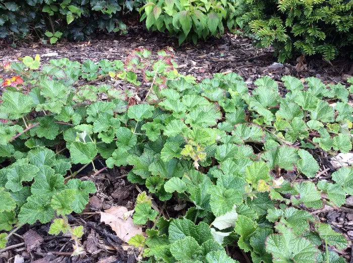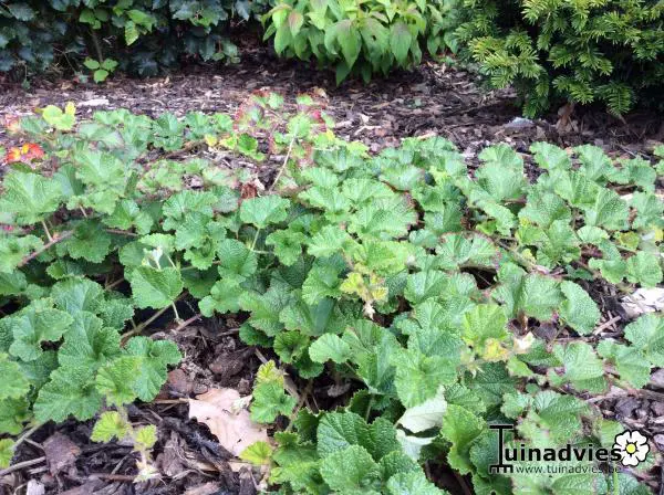 C’est un arbuste bas couvert du sol avec des feuilles gris-vert magnifiquement structurées, qui prennent un joli rouge bordeaux en automne.