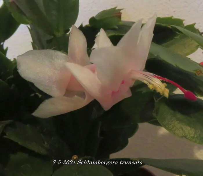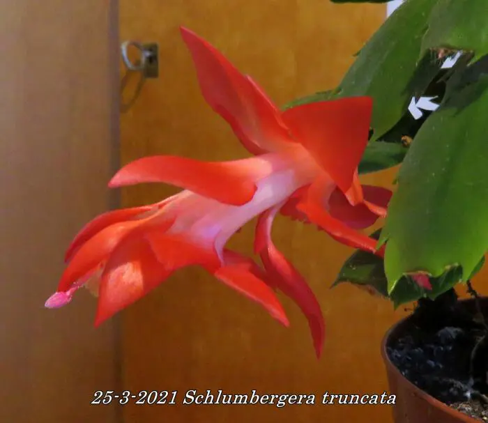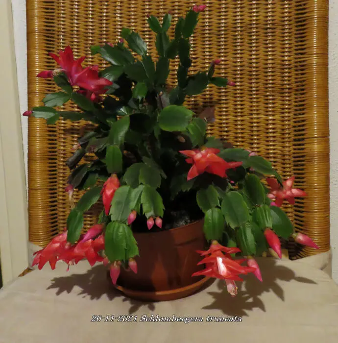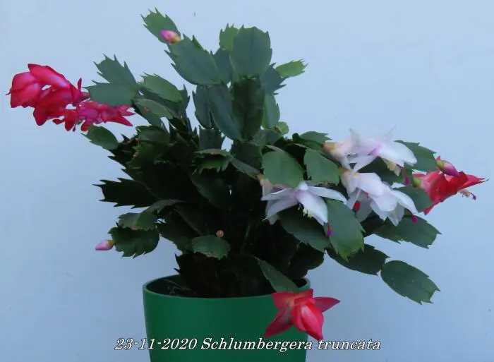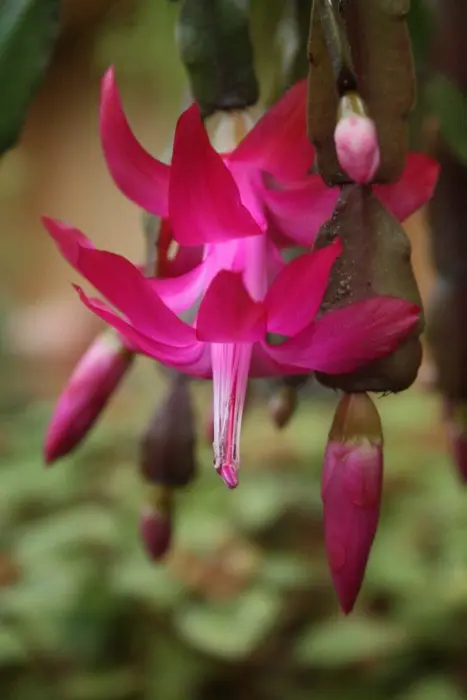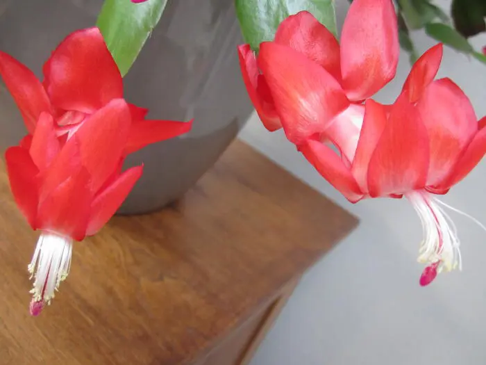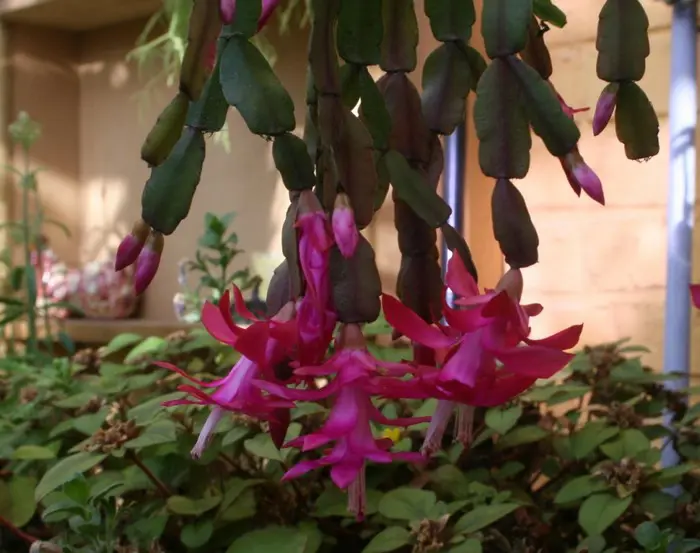 Schlumbergera truncata est un cactus dont les tiges surplombent composées de parties plates.