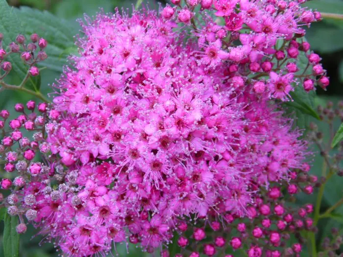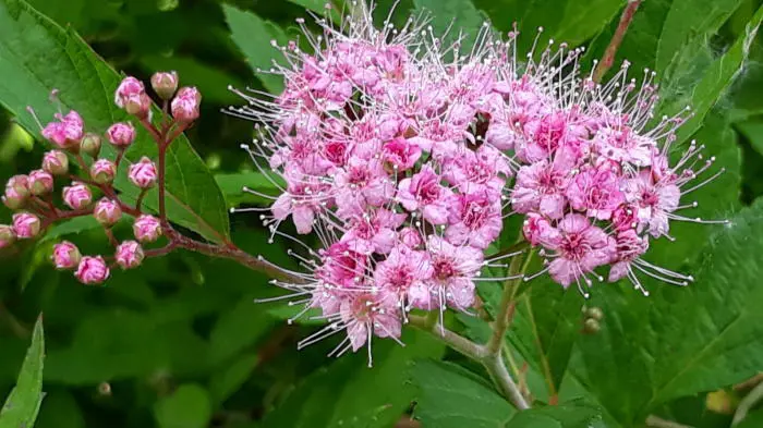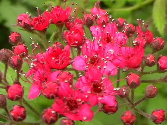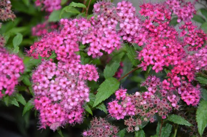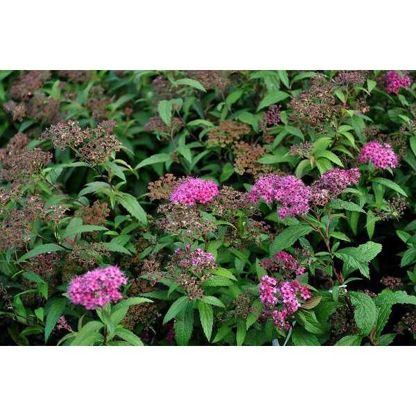 Spiraea japonica 'Anthony Waterer' est sans doute la plus cultivée de toutes les spirées japonaises, formant un arbuste vertical et compact aux feuilles allongées.