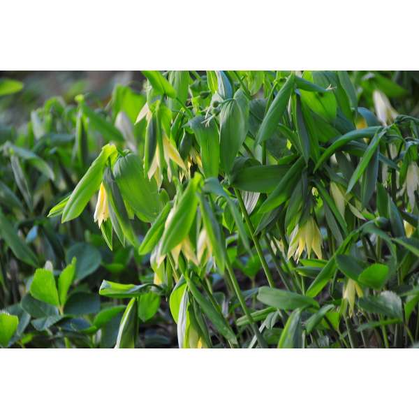 Uvularia grandiflora var. Pallida a une feuille plus large que l’espèce et fleurit avec des fleurs jaune soufré.