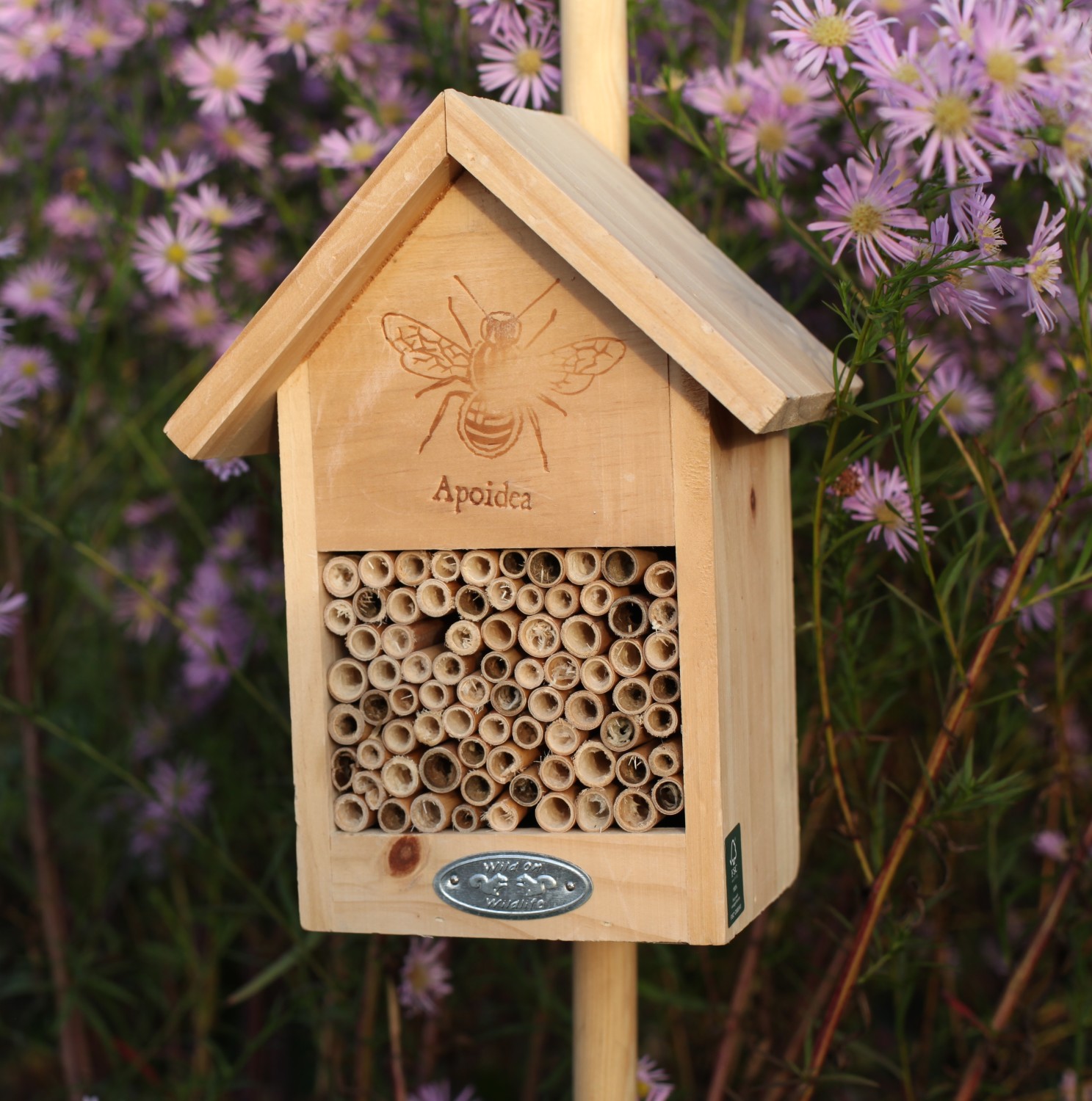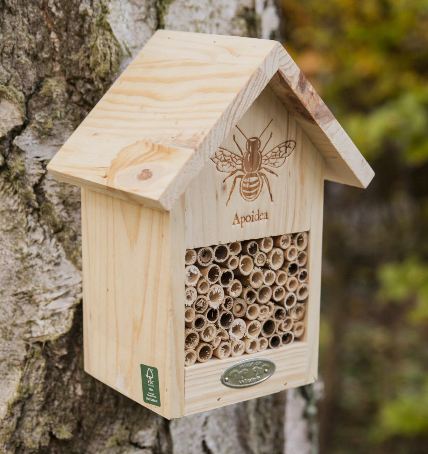 Cette ruche en bois naturel présente l’image de marque d’une abeille solitaire avec la légende « Apoidea », la famille à laquelle ils appartiennent.