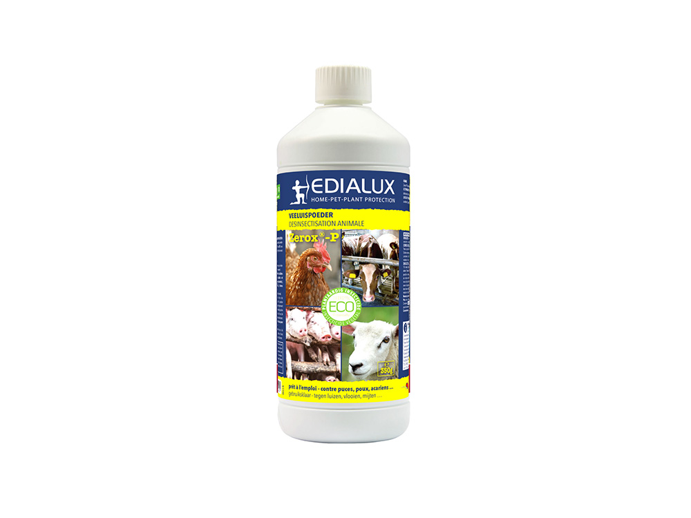 Zerox-P est une poudre insecticide prête à l’emploi contre les acariens rouges, les acariens et les puces , à base de pyrethrum, un extrait végétal extrait de divers chrysanthèmes. Il est utilisé pour le contrôle des ectoparasites dans les enclos et les écuries de bovins jeunes et adultes, de chevaux et poneys, ainsi que de volailles telles que poulets, porcs, moutons, chèvres et lapins. Appliquez la poudre en fines couches aux endroits où se trouvent les ectoparasites.