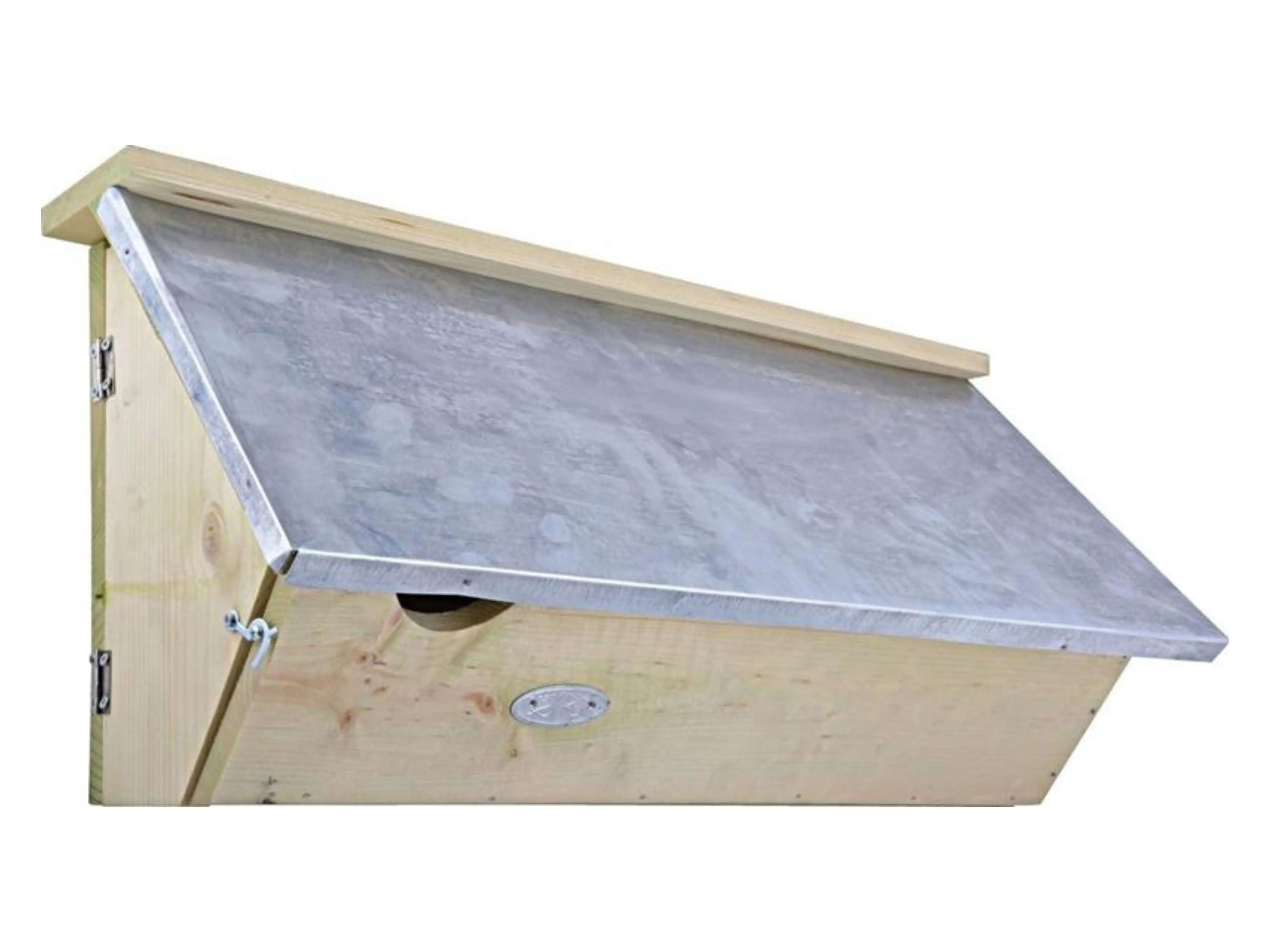 Il y a une porte sur le côté pour ouvrir le placard. De cette façon, vous pouvez mettre un peu de foin dans le placard avec lequel ils le font. C’est ainsi que les hirondelles construisent leur nid. Le nettoyage n’est généralement pas nécessaire. Le dessus de l’armoire est recouvert d’un toit en zinc.