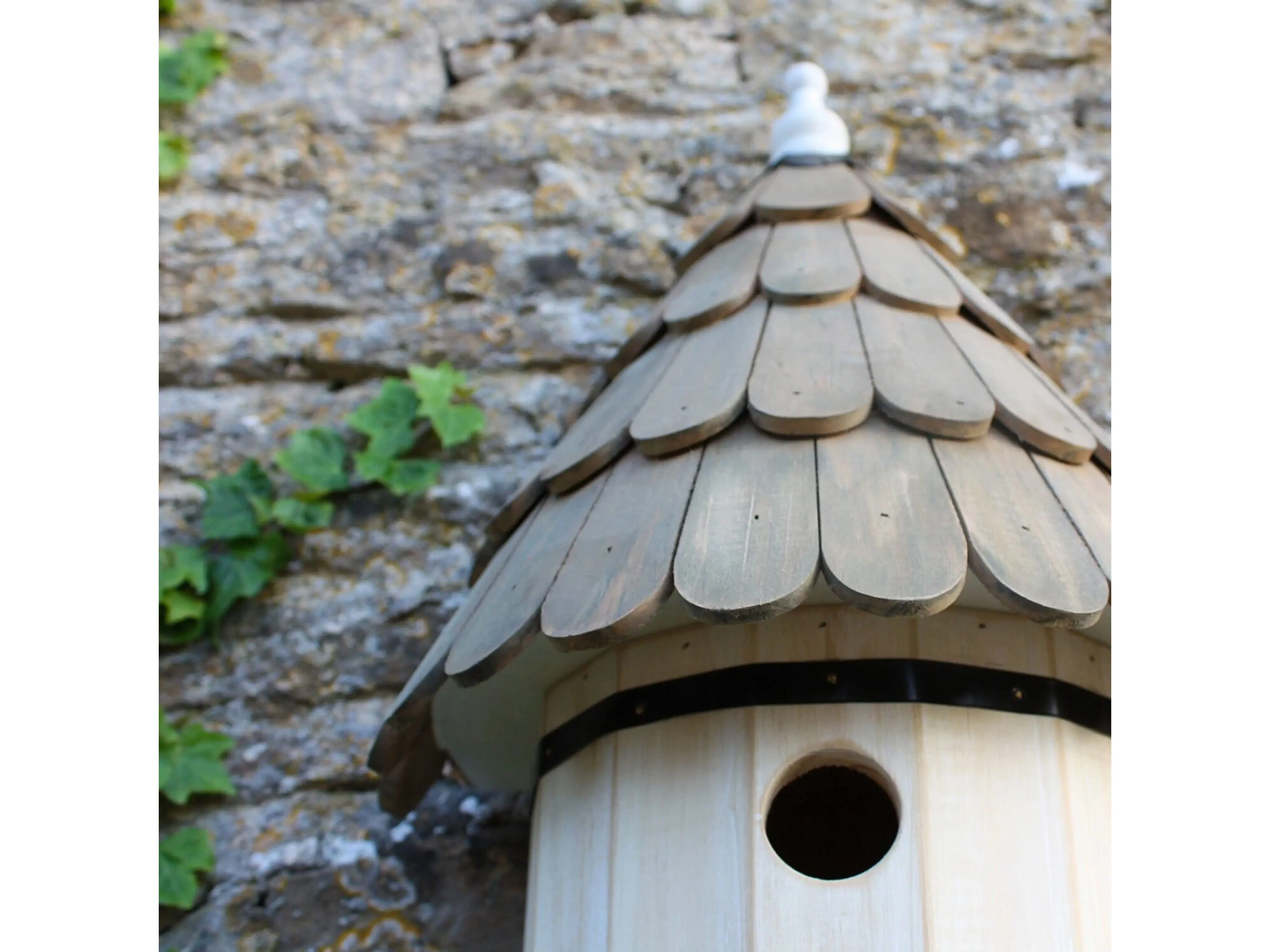 Nichoir décoratif avec bardeaux en bois faits main avec une flèche blanche décorative pour petits oiseaux chanteurs en forme de pigeon traditionnel. Le toit est constitué de bardeaux de bois sculptés à la main , imprégnés de façon transparente. Le cabinet à dos plat présente une patine pâle et est fini avec des bandes métalliques noires. L’arrière peut être ouvert pour l’entretien de la boîte à nid. Le design est solide et robuste, et fabriqué en bois certifié FSC.