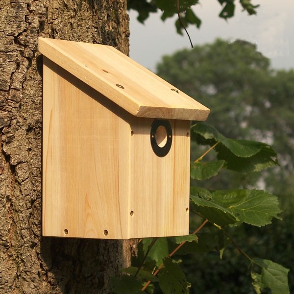 L’entrée de cette boîte est équipée d’une plaque de protection en cuivre, de sorte que dans notre région, principalement le bleu a accès à cette boîte (28 mm). Mais avec un peu de chance, vous recevrez la visite d’un blackcap, brillant ou noir. Si vous retirez la plaque, les moineaux et les grands auront aussi accès à cette boîte (32 mm).