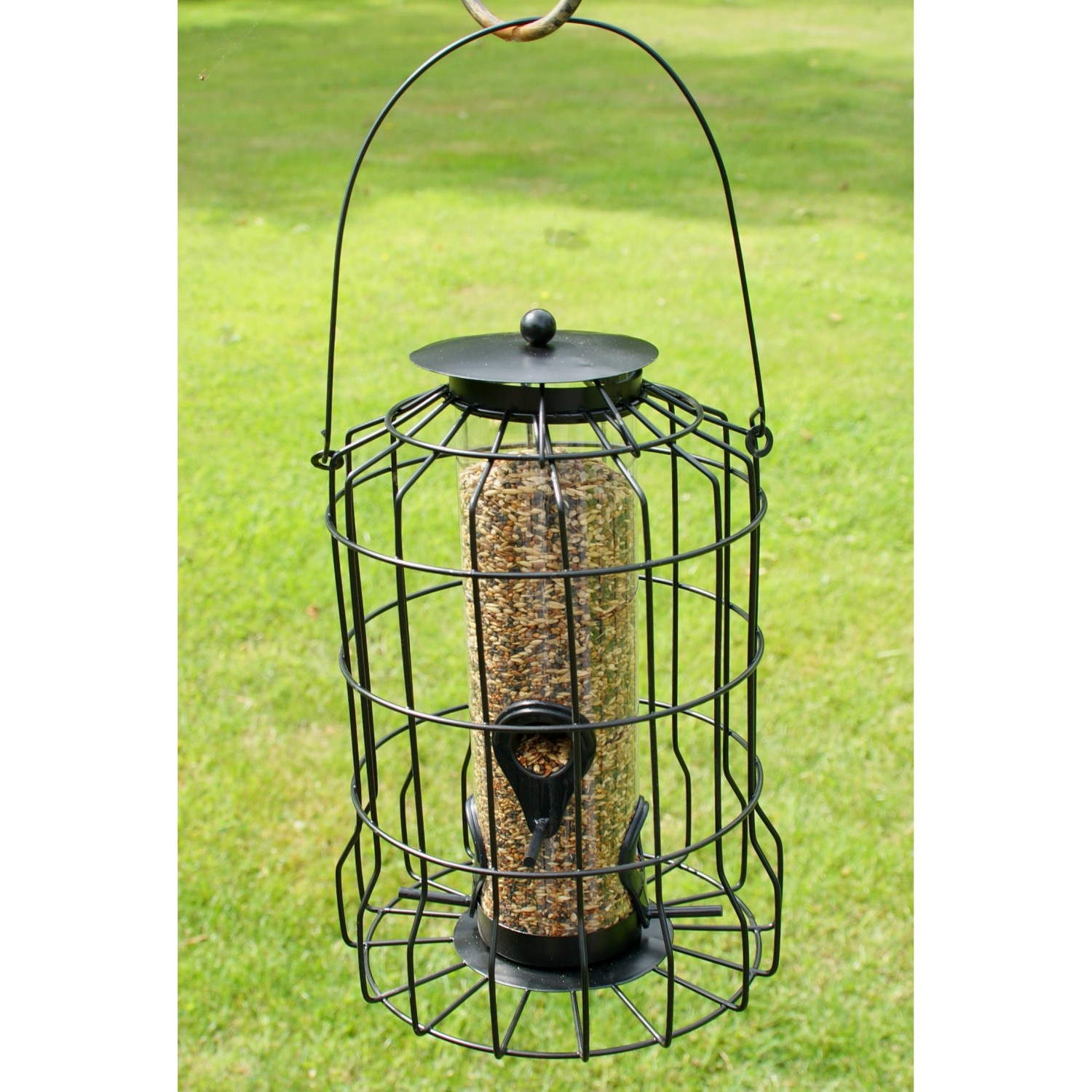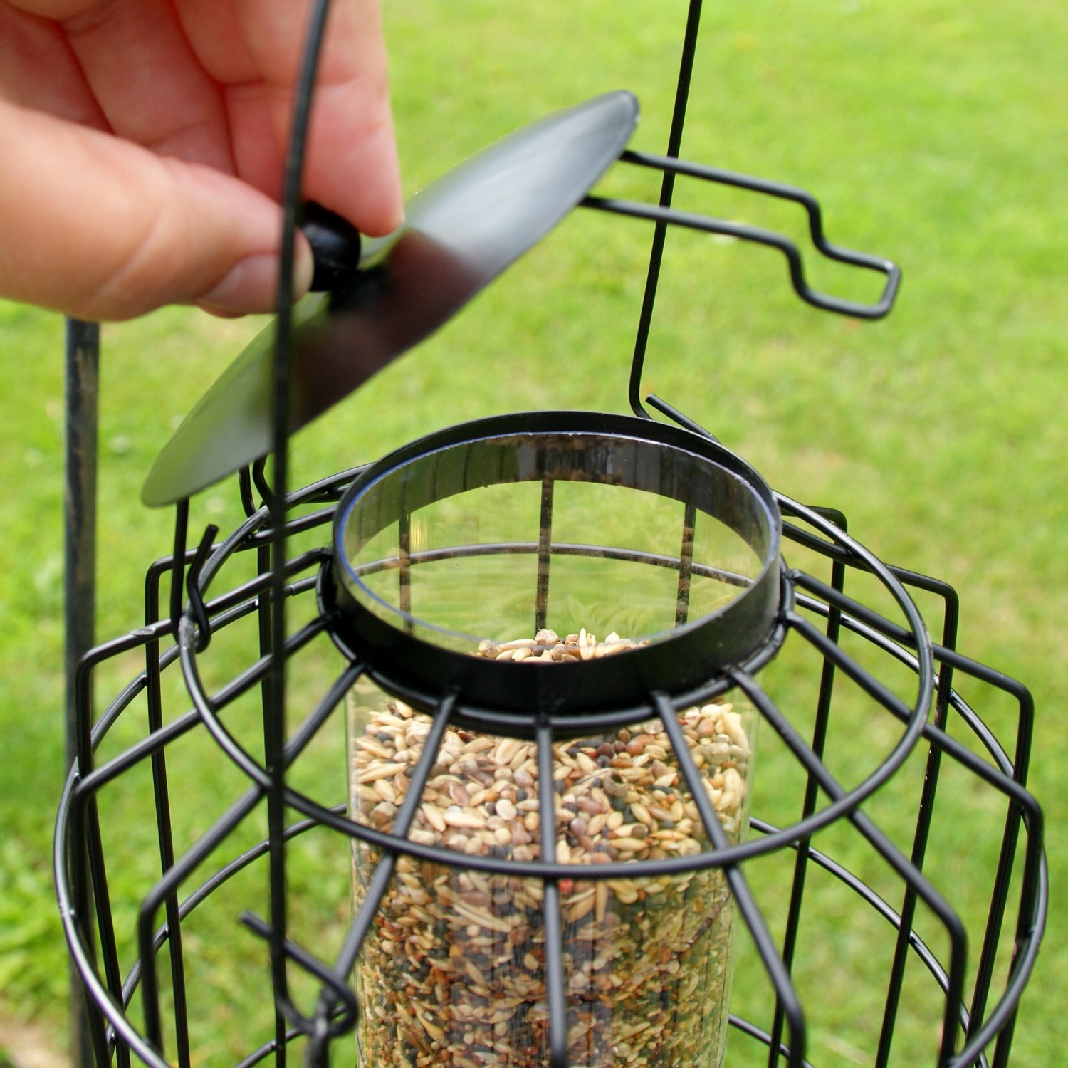 Ce silo innovant pour semences permet uniquement aux petits oiseaux de manger la nourriture. La cage protectrice autour du silo tient à distance les corbeaux, les pies, les choucas et d’autres grands oiseaux. Avec quatre ouvertures, les petits oiseaux peuvent facilement accéder à la graine.