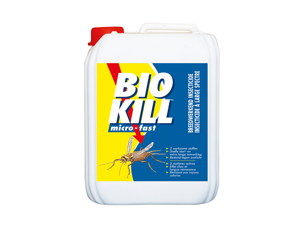 Biokill Micro-Fast offre un très large éventail d’activités contre les insectes volants et rampants. Ça fonctionne très bien aussi bien qu’à la maison comme dans les environs. C’est aussi un puissant spray pour panier et tapis contre les ectoparasites (puces, tiques, acariens,...) chez les animaux.