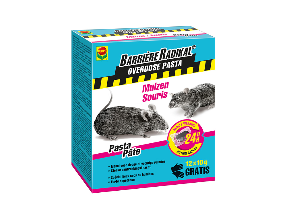 Cet appât, sous forme de pâte, contient une substance qui ralentit le fonctionnement du cœur et fait s’endormir les souris. Le produit a un effet rapide : la souris devient hypothermique et meurt 24 heures après l’ingestion. La formulation micro-encapsulée confère au produit un grand attrait auprès des souris. Ainsi, ce produit prêt à être utilisé et résistant à l’humidité peut être utilisé dans des pièces sèches (greniers, sols, faux murs, garages, etc.) ainsi que dans des pièces humides (sous-sols, entrepôts, etc.).