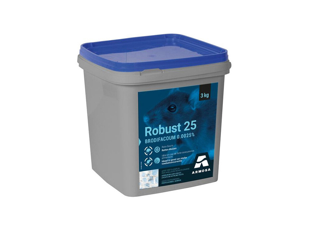 Robust 25 est une pâte prête à l’emploi à base de brodifacoum. Une pâte très attrayante et tendre, riche en graisses et très résistante à l’humidité . La pâte extermine tous les rats et souris, même s’il y a d’autres aliments à proximité. L’odeur et le goût du poison sont si attrayants que le rongeur préfère généralement l’appât et ignore les autres aliments.