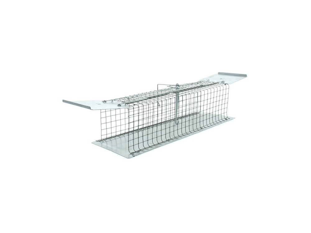 Cage galvanisée pour piège à rats recouverte d’une couche de zinc pour prévenir la rouille. La cage comporte deux entrées , augmentant les chances d’attraper des rats.
