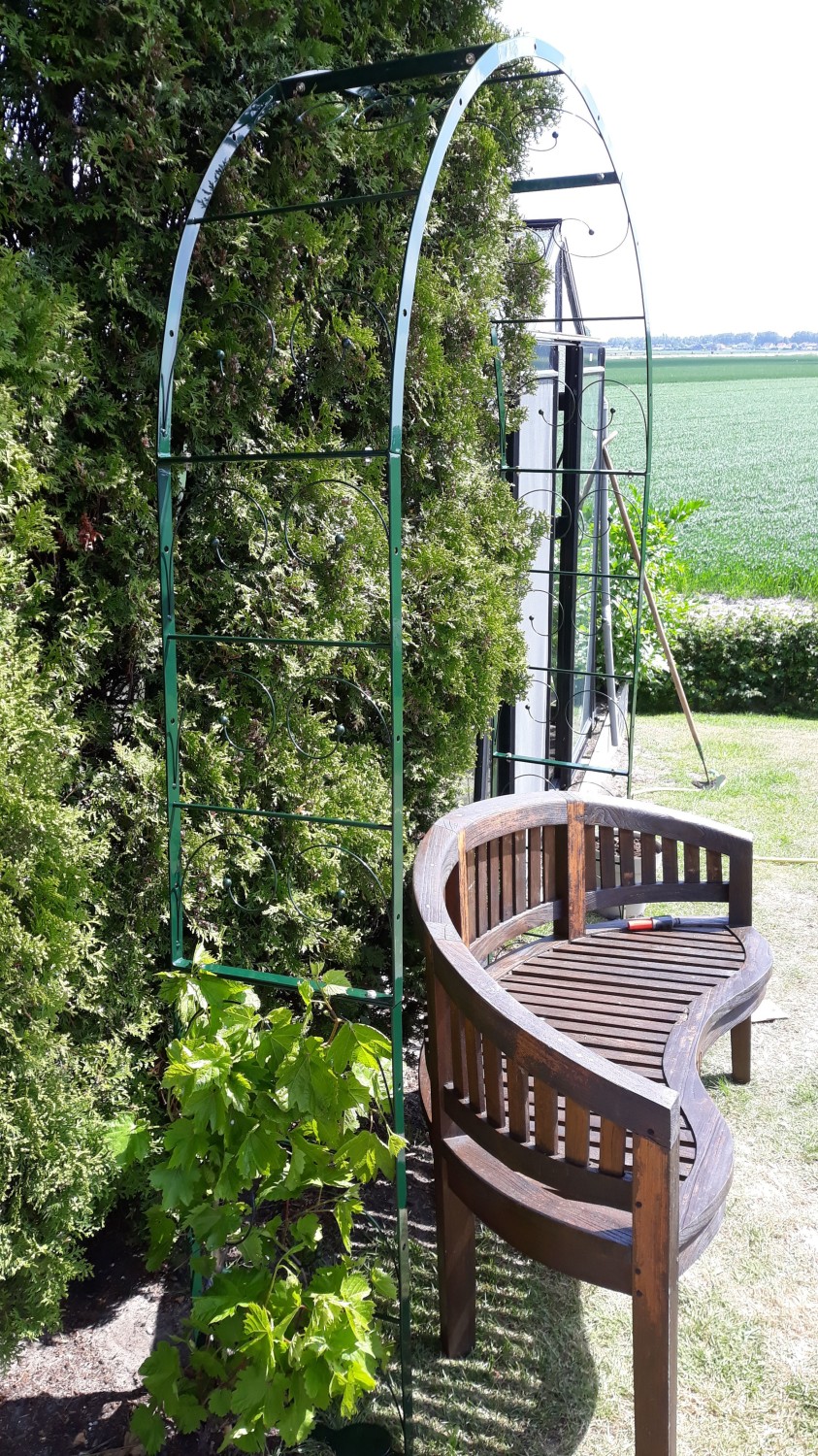 Arche pour rosiers de très bonne qualité. Une arche très solide qui est munie de câbles de croissance pliables pour guider les plantes grimpantes. Cela rend inutile l'usage de beaucoup de liens.