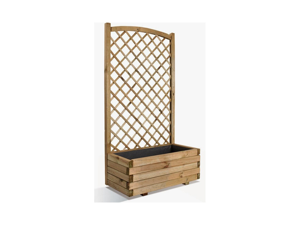 Jardinière en bois en pin massif durable avec treillis assorti. Illuminez votre terrasse avec cette belle grande jardinière durable avec son treillis. Le haut du cadre de treillis est incurvé, ce qui rend le treillis beau et haut.