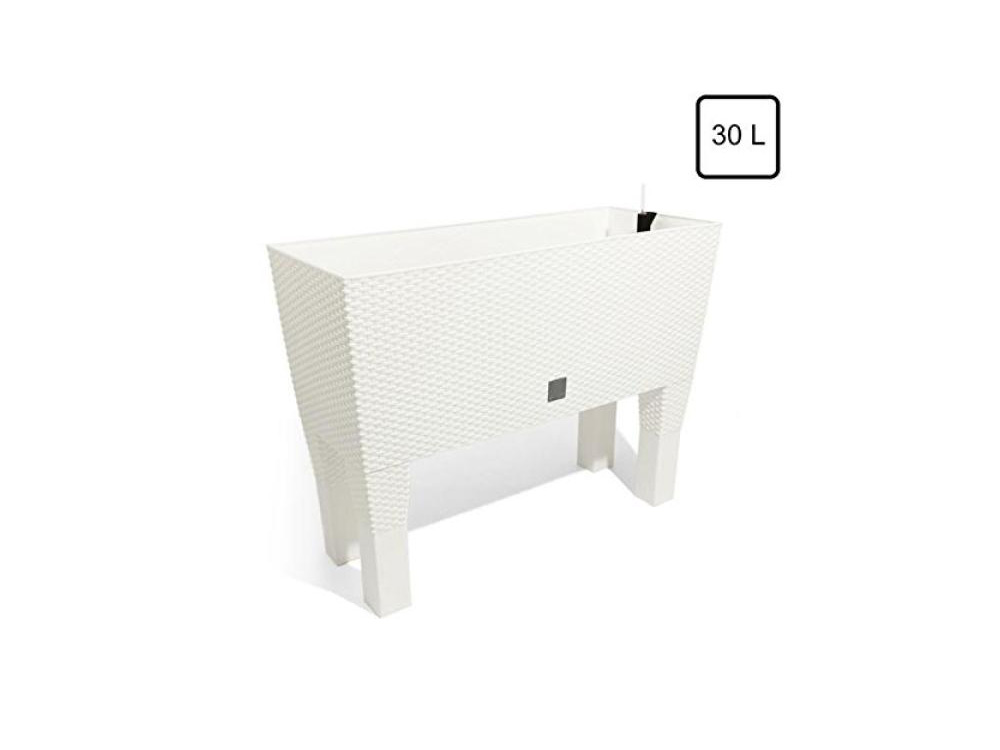 Beau bac à plantes rectangulaire en plastique durable avec système d'irrigation très pratique. Ce bac à plantes, blanc, très décoratif, dispose d'un système d'irrigation très pratique. Un plateau de drainage noir perforé sépare la couche de terre du réservoir d'eau qui peut être rempli le long d'un tube avec un flotteur qui atteint le sommet du bac.
