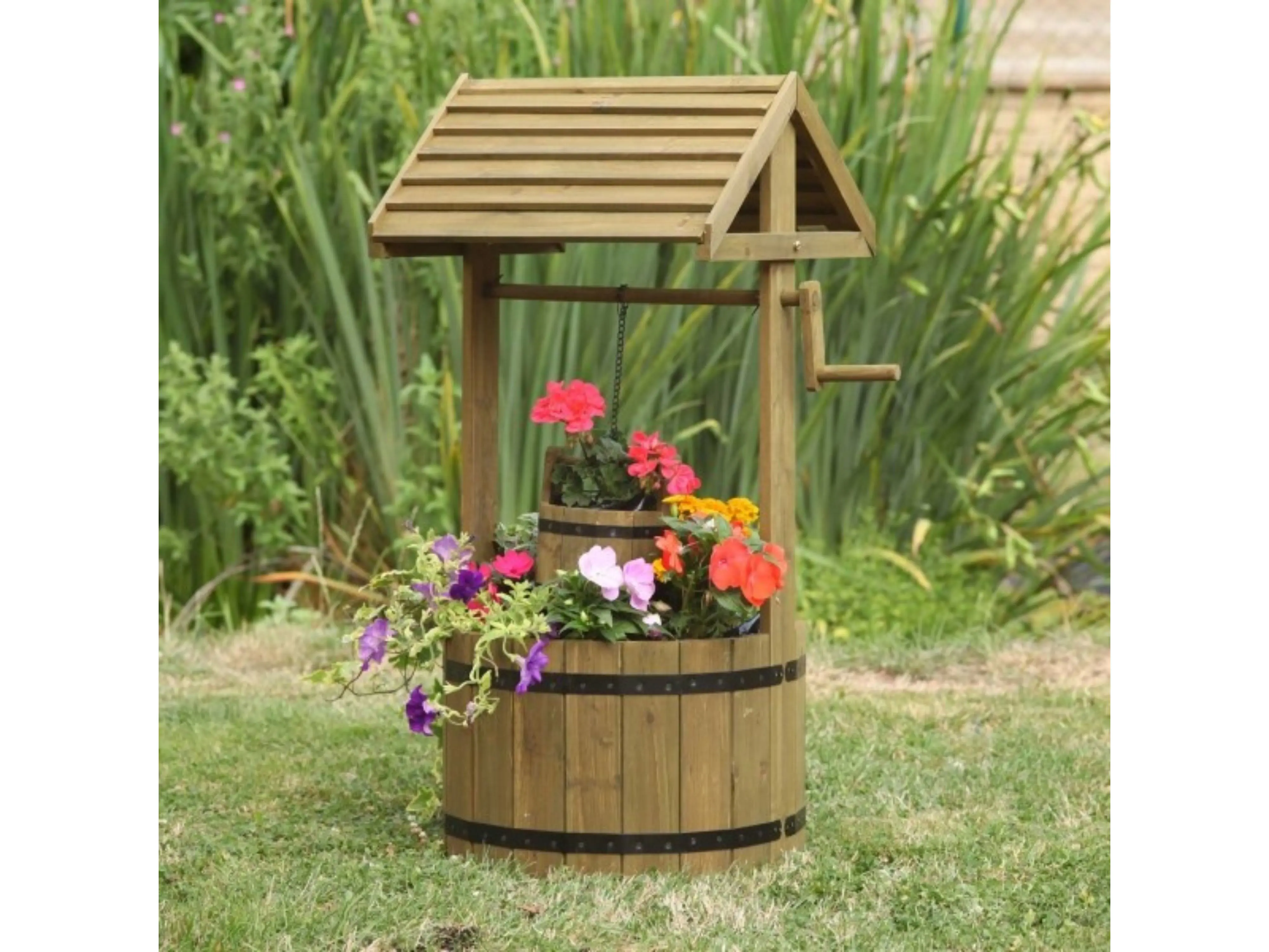 Ce puits à souhaits en bois parle à l'imagination. Placez ce bac à fleurs décoratif et plantez le avec des plantes annuelles colorées.