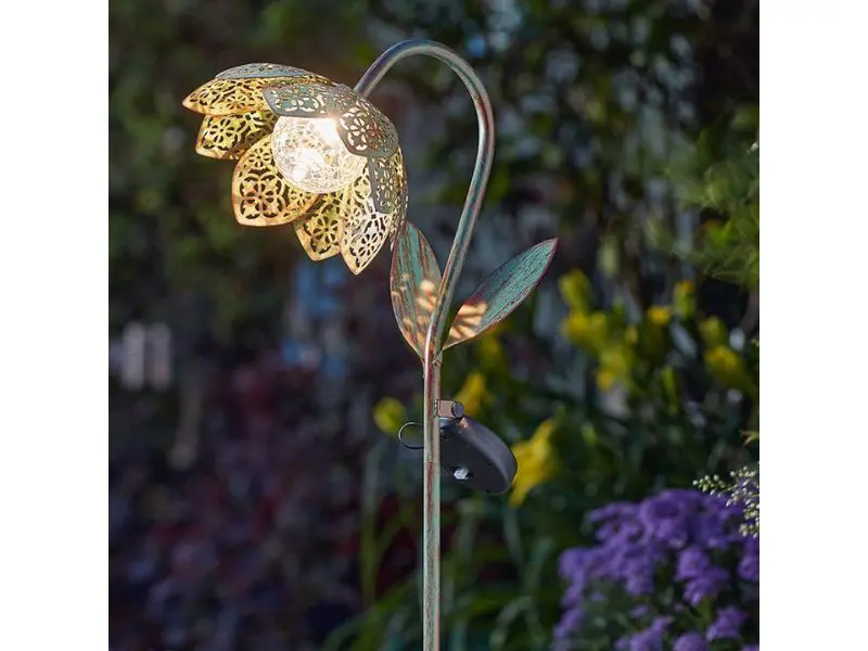Le magnifique motif de lotus crée un motif de silhouette magique la nuit et attire l’œil en plein jour ! La finition verte naturelle est complétée par une structure en broussailles en bronze. Une boule de craquelement blanche de 8 cm de 8 cm qui change de couleur forme le centre central solaire élégant ! Parfait pour les allées de jardin, allées, patios, pots et massifs de fleurs.