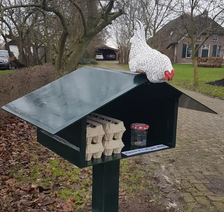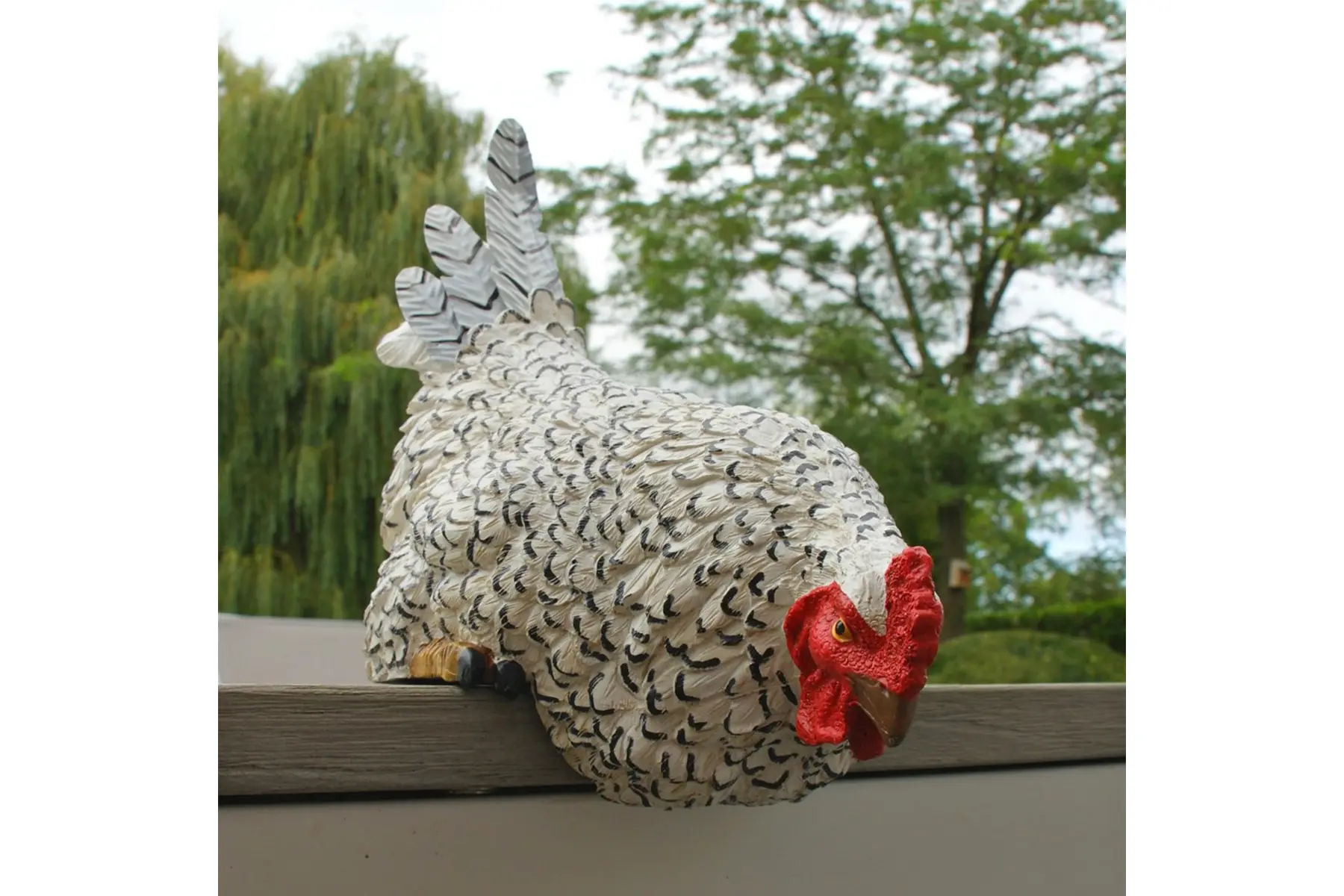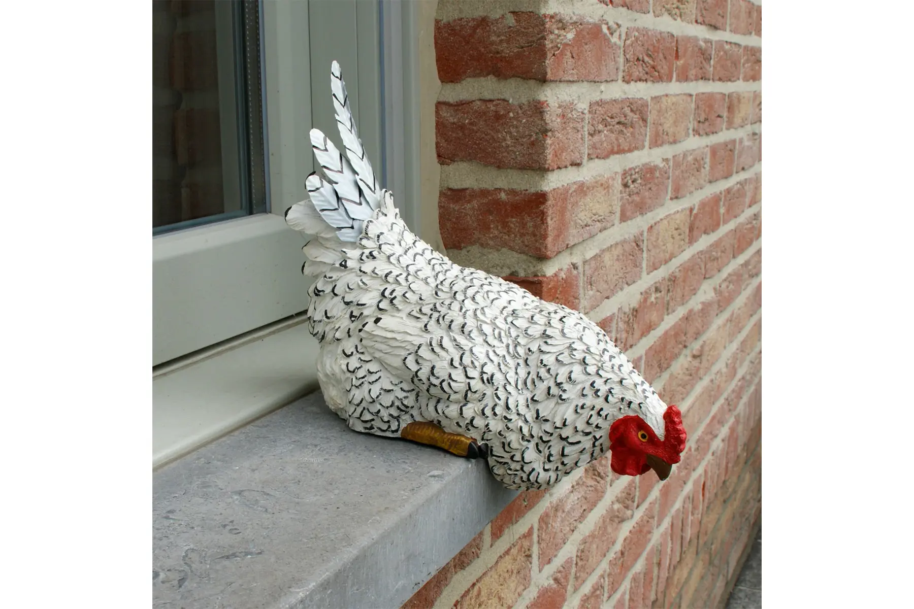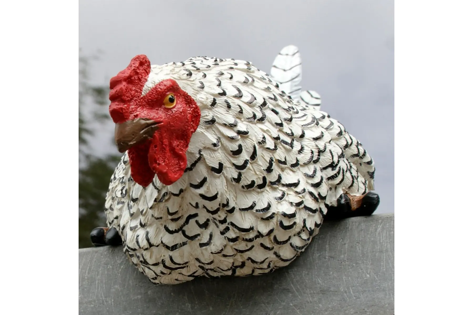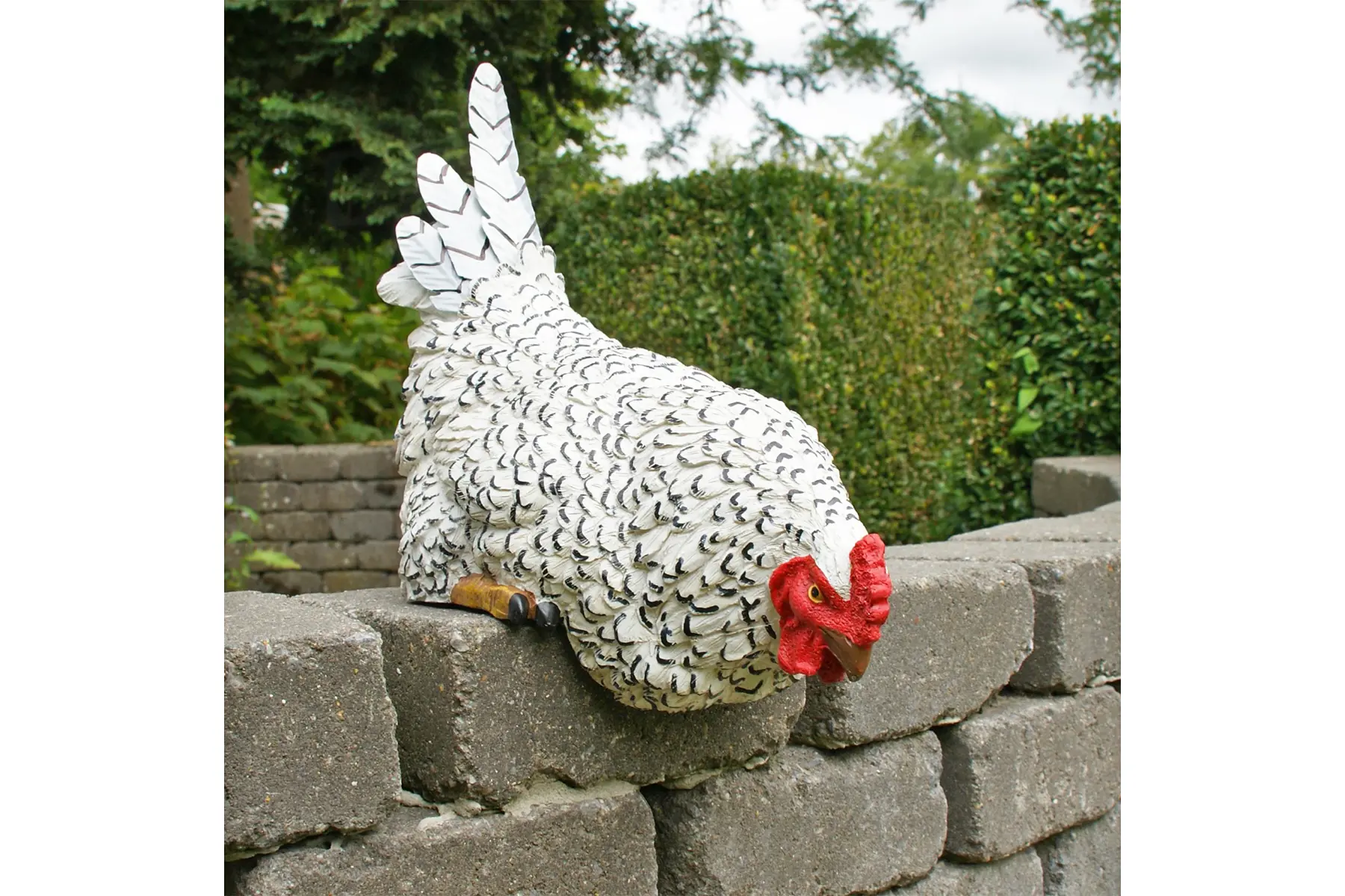Cette poule très curieuse vous épie comme une vraie, posée sur le bord de votre mur de jardin, poulailler, table de jardin ou armoire de cuisine. Le plumage blanc avec des touches noires, une tête rouge et la forme unique font de cette poule une figure originale et très décorative.