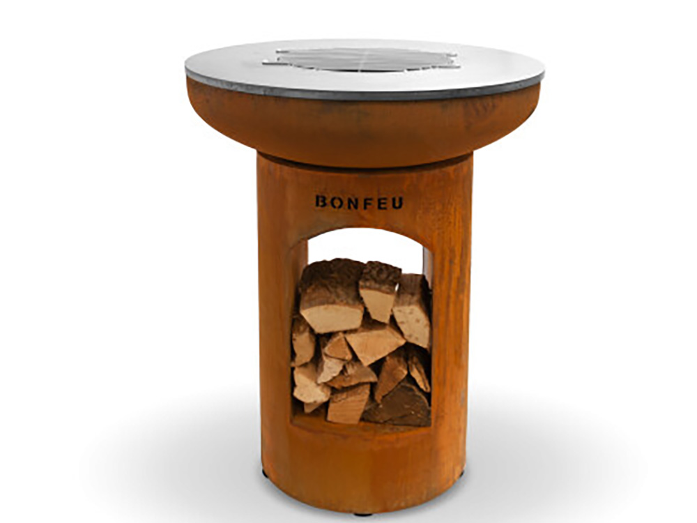 Le Bonfeu Bonbiza est livré avec une plancha adaptée et une grille de barbecue, transformant l'ensemble en une véritable cuisine d'extérieur. La base est fabriquée en acier corton avec un aspect rouillé.