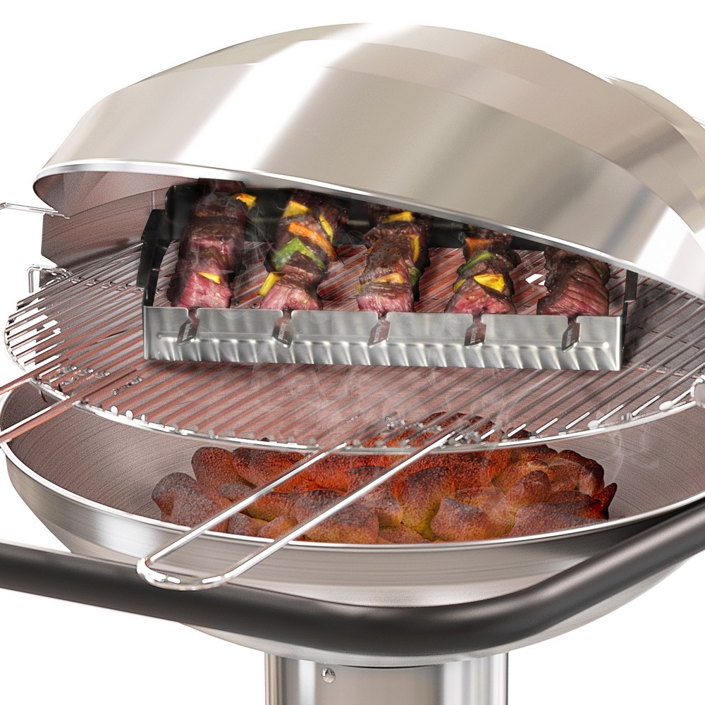 Le support solide s'adapte sur la plaque de grillade de tout barbecue et offre de la place pour 5 piques à brochette.