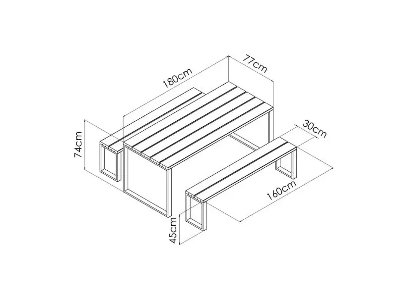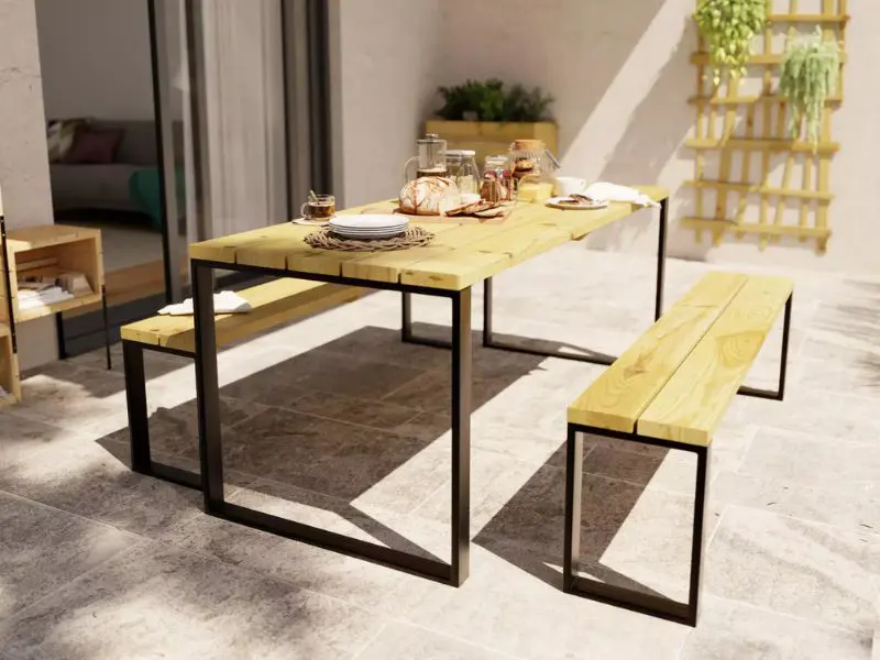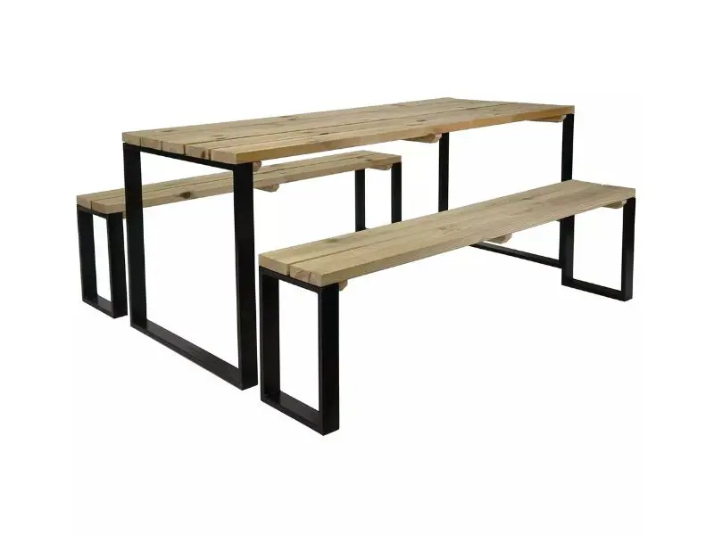 La table est fabriquée en pin grossier certifié PEFC et comprend deux bancs en métal et en bois. Il a un look moderne et chaleureux et s’intègre parfaitement à votre espace extérieur.
