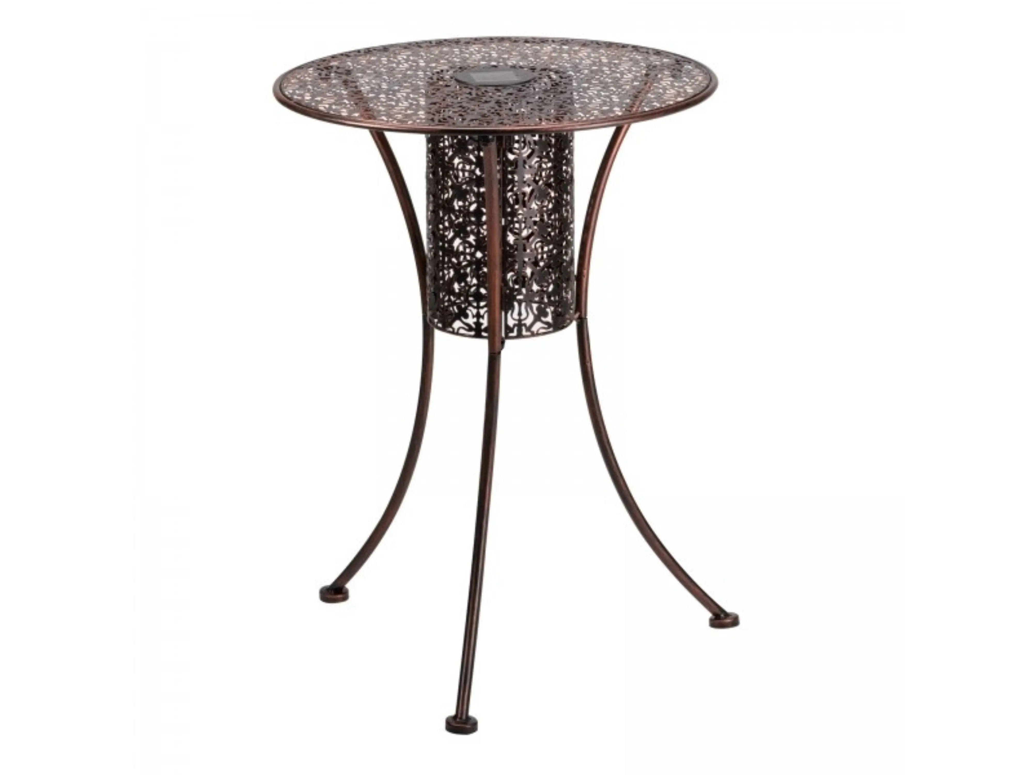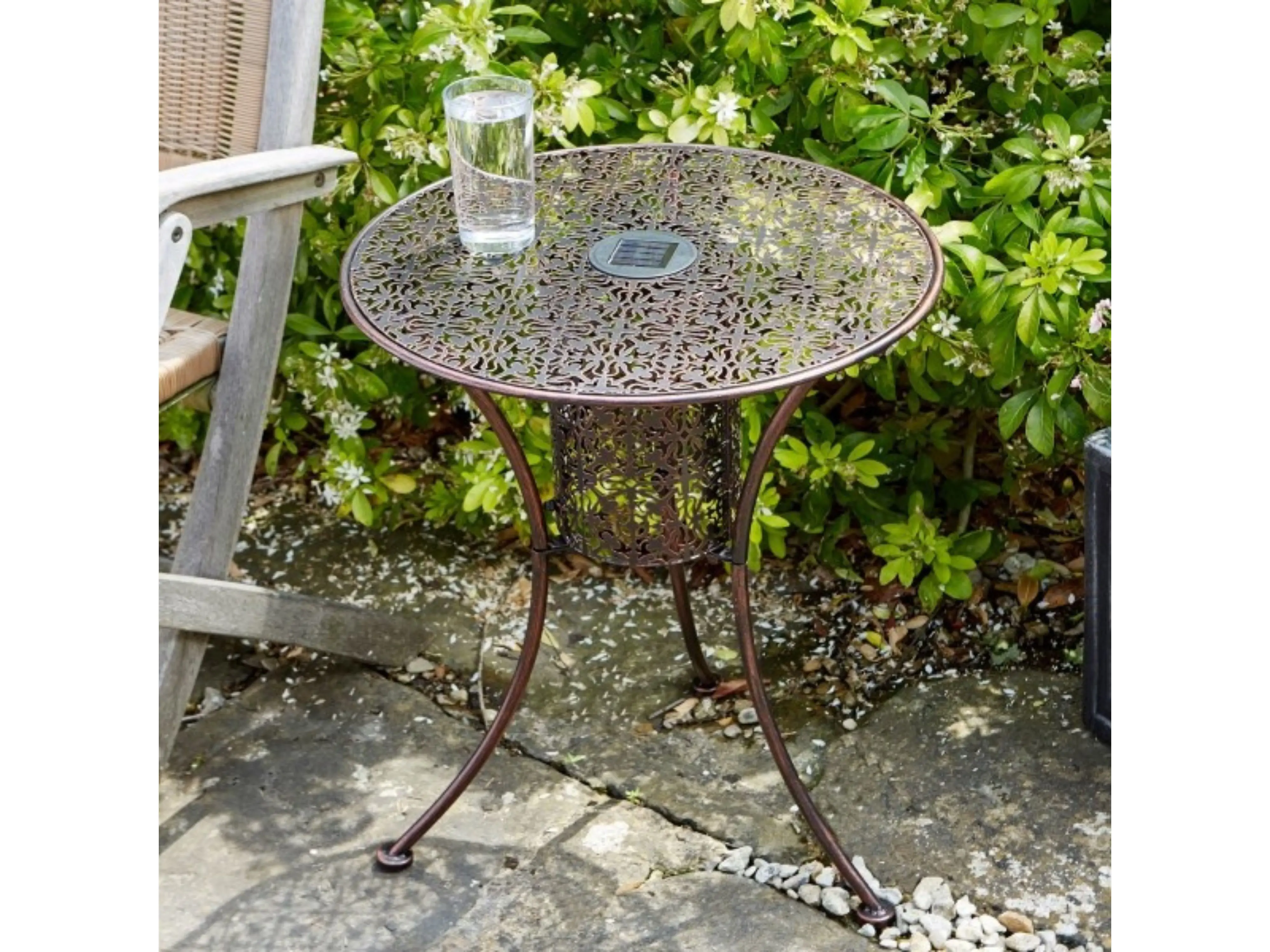 Cette belle table d'appoint en métal décoratif a un panneau solaire central qui recharge la batterie assortie. Une table à placer en plein soleil. De quoi permettre à la table de rayonner quand le soir tombe.
