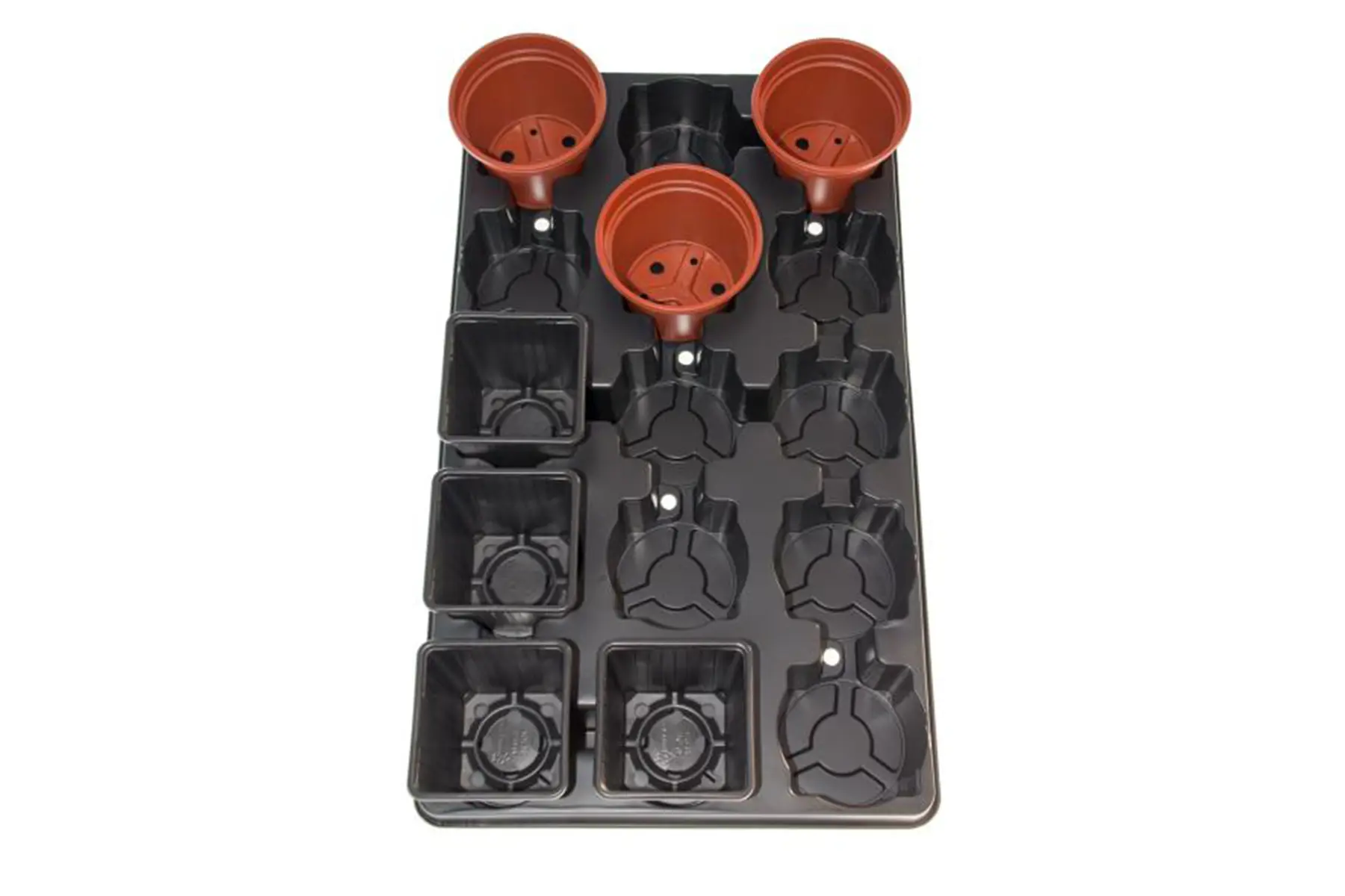 Plateau de culture pour les pots ronds ou carrés. Ces plateaux réutilisables peuvent contenir 15 pots de culture (5 x 3). Grâce aux découpes uniques, les pots ronds et carrés tiennent dans les plateaux.