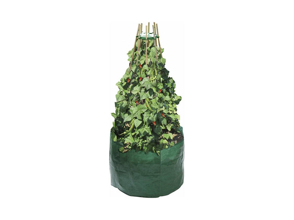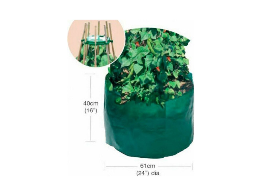 Environ 8 plants de haricots ou de pois peuvent être cultivés par sac. Le sac de culture est un sac robuste et durable en polyéthylène tressé solide. Il est également protégé du soleil (résistant aux UV) et peut être réutilisé pendant plusieurs saisons .