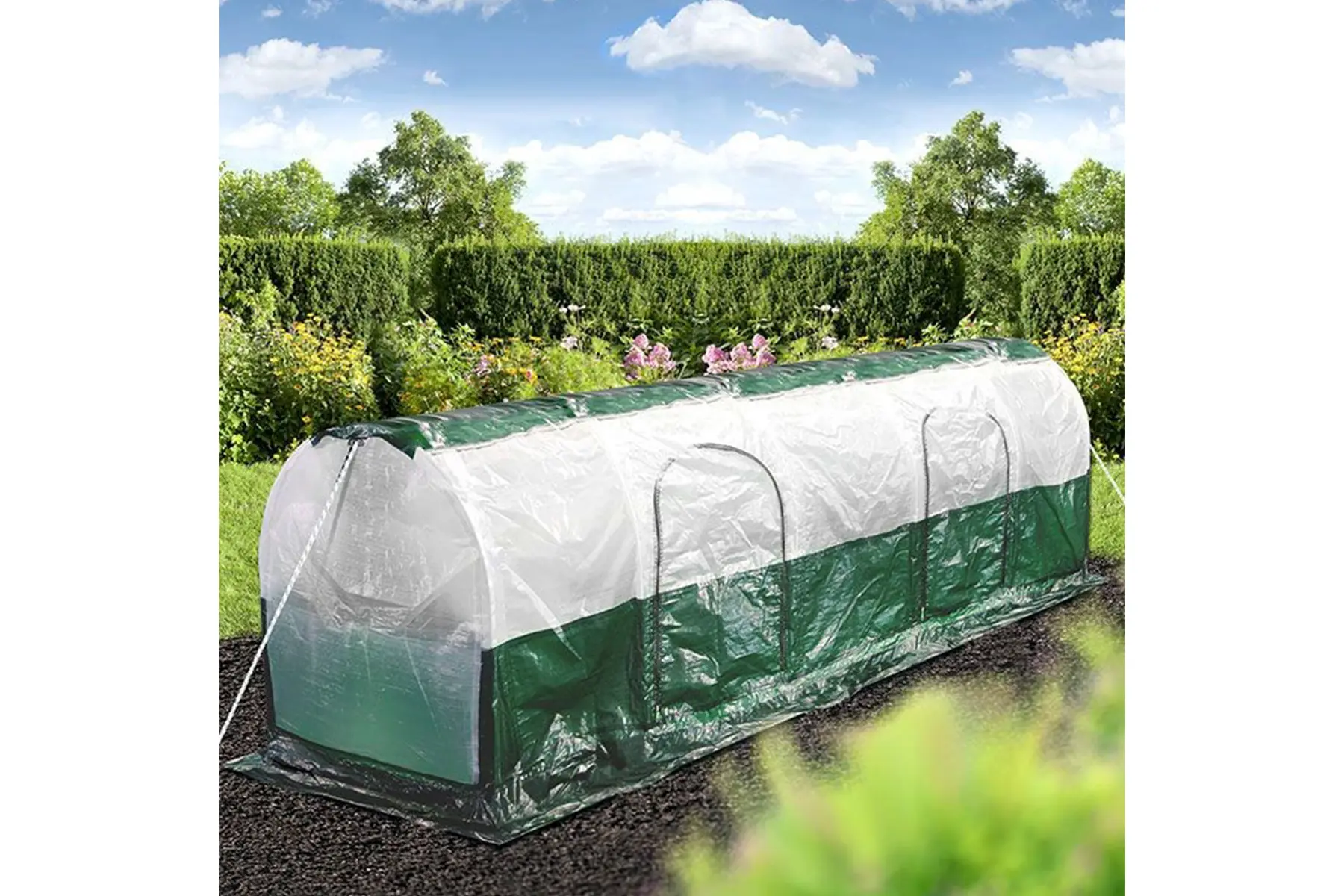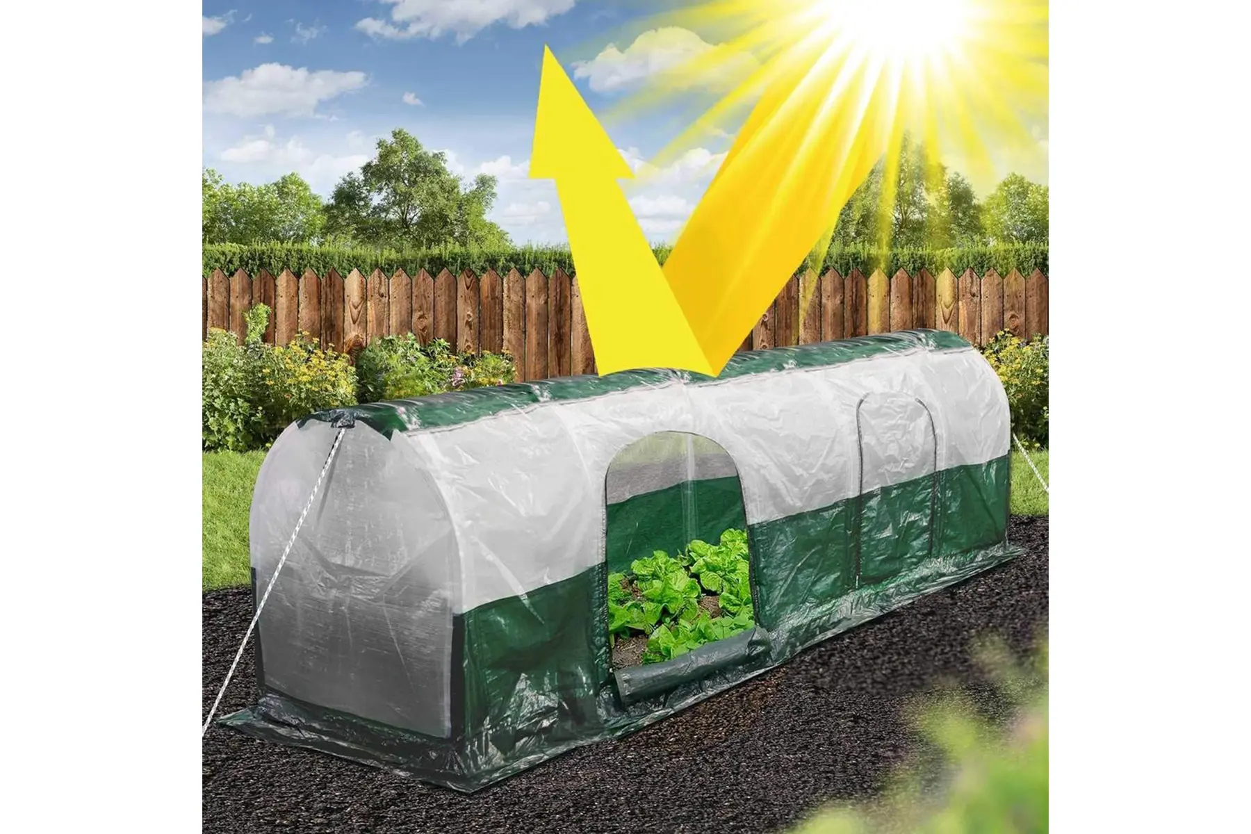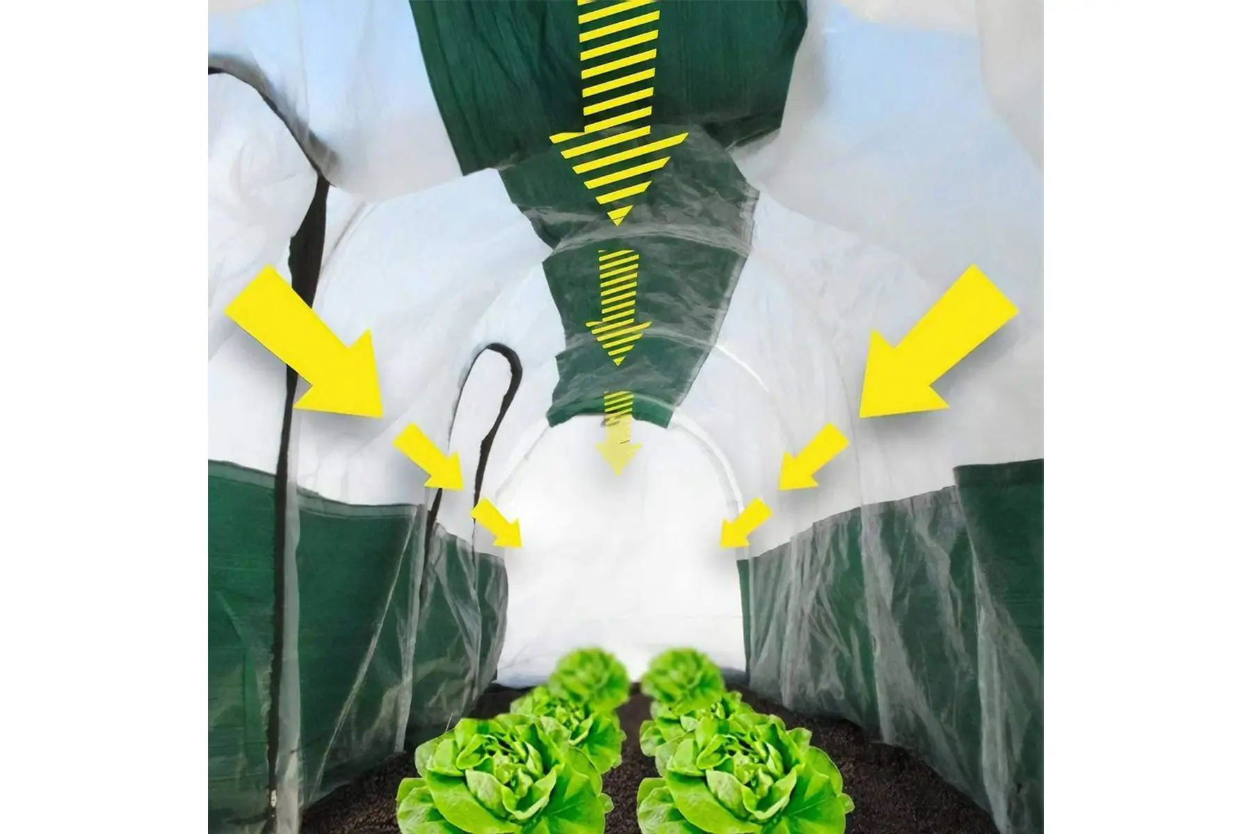 Deux ouvertures offrent la ventilation et un accès facile aux plantes pour en prendre soin. Du papier d’ombre a été cousu dans le toit contre la lumière excessive du soleil. Tunnel idéal pour commencer la saison de reproduction plus tôt. Pour une croissance plus rapide des plantes en dessous. Dimensions idéales pour protéger les cultures dans les massifs surélevés ou le potager.