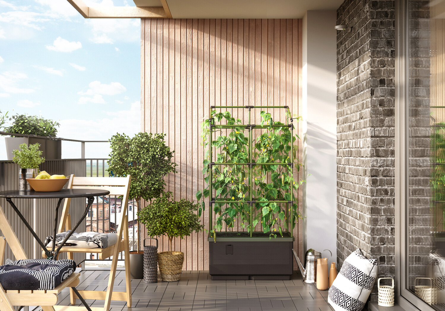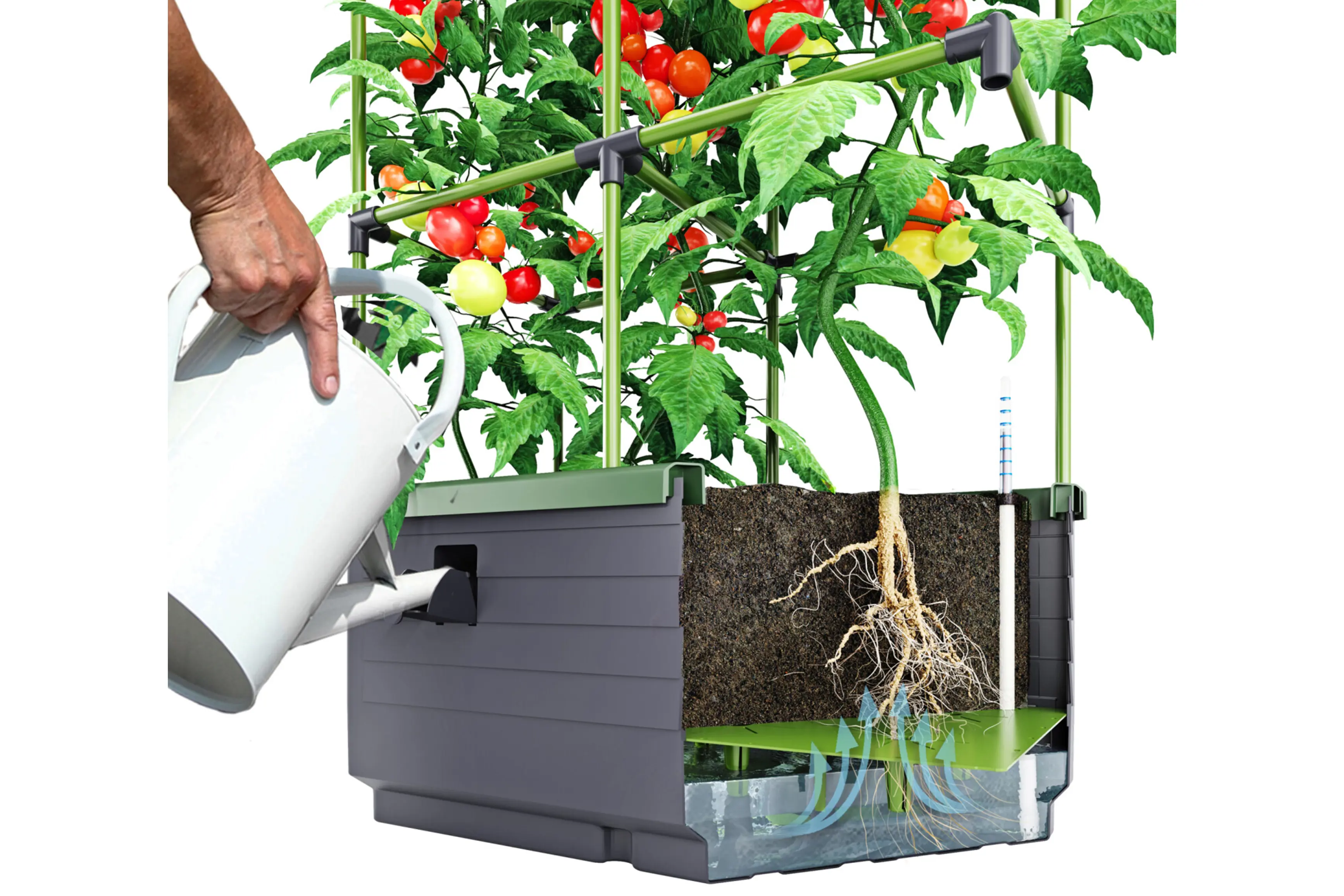 Pratique à utiliser ! La jungle urbaine est idéale pour les amateurs de tomates et de courgettes , et offre aux personnes qui n’ont pas de jardin la possibilité de cultiver ces cultures. Grâce au système d’irrigation intégré , vos plantes recevront toujours la quantité d’eau désirée. Le réservoir d’eau de 17 litres peut facilement être rempli avec un arrosoir ou un tuyau d’arrosage. L’aide à l’escalade est idéale pour les plantes grimpantes comme les tomates. Les plantes ont une prise et peuvent ainsi croître et fleurir de manière optimale.