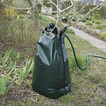 Sac d’irrigation pour arroser intelligemment les arbres fraîchement plantés . Le sac est enroulé autour de la poignée et rempli d’eau. Sur une période de 5 à 6 heures, le sac relance son eau dans le sol autour de l’arbre. Cela favorise la croissance des jeunes plants, juste après la plantation.