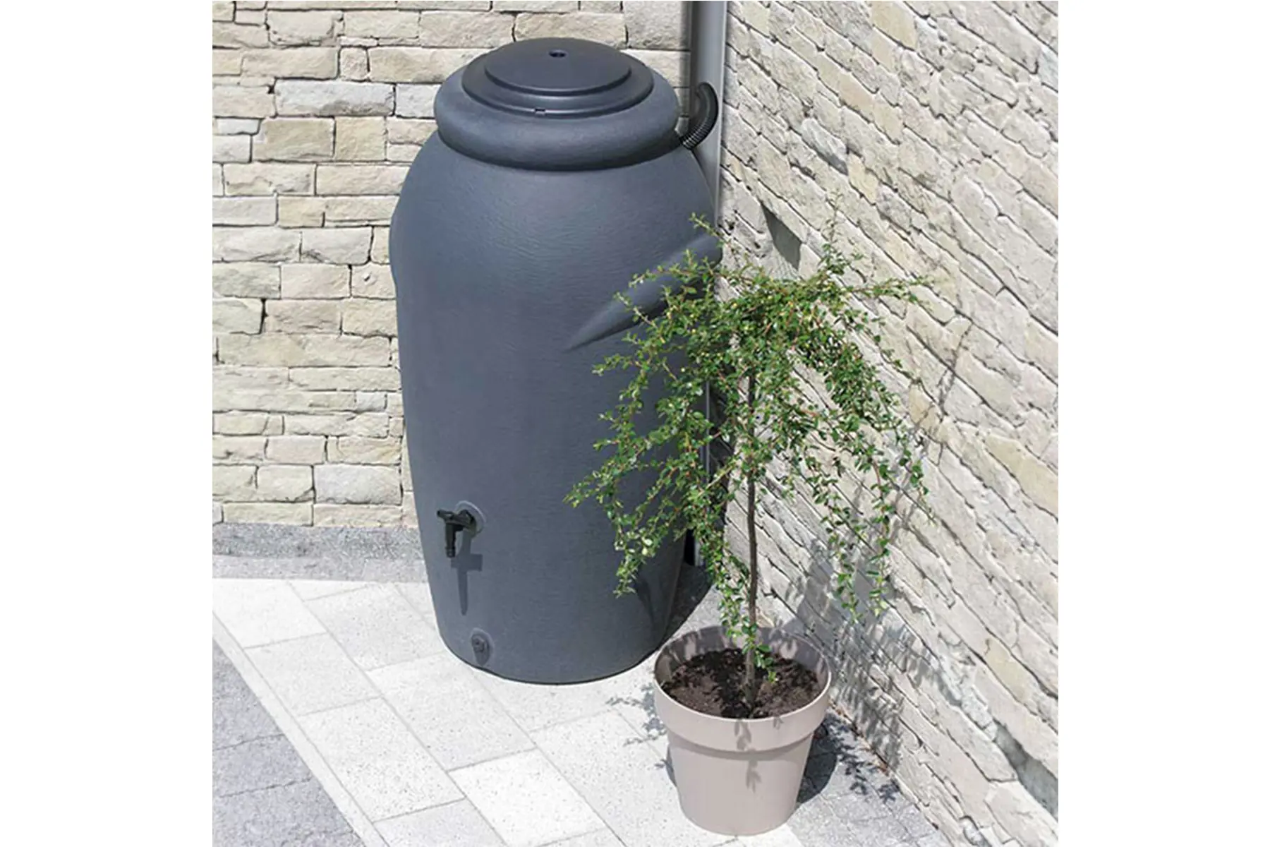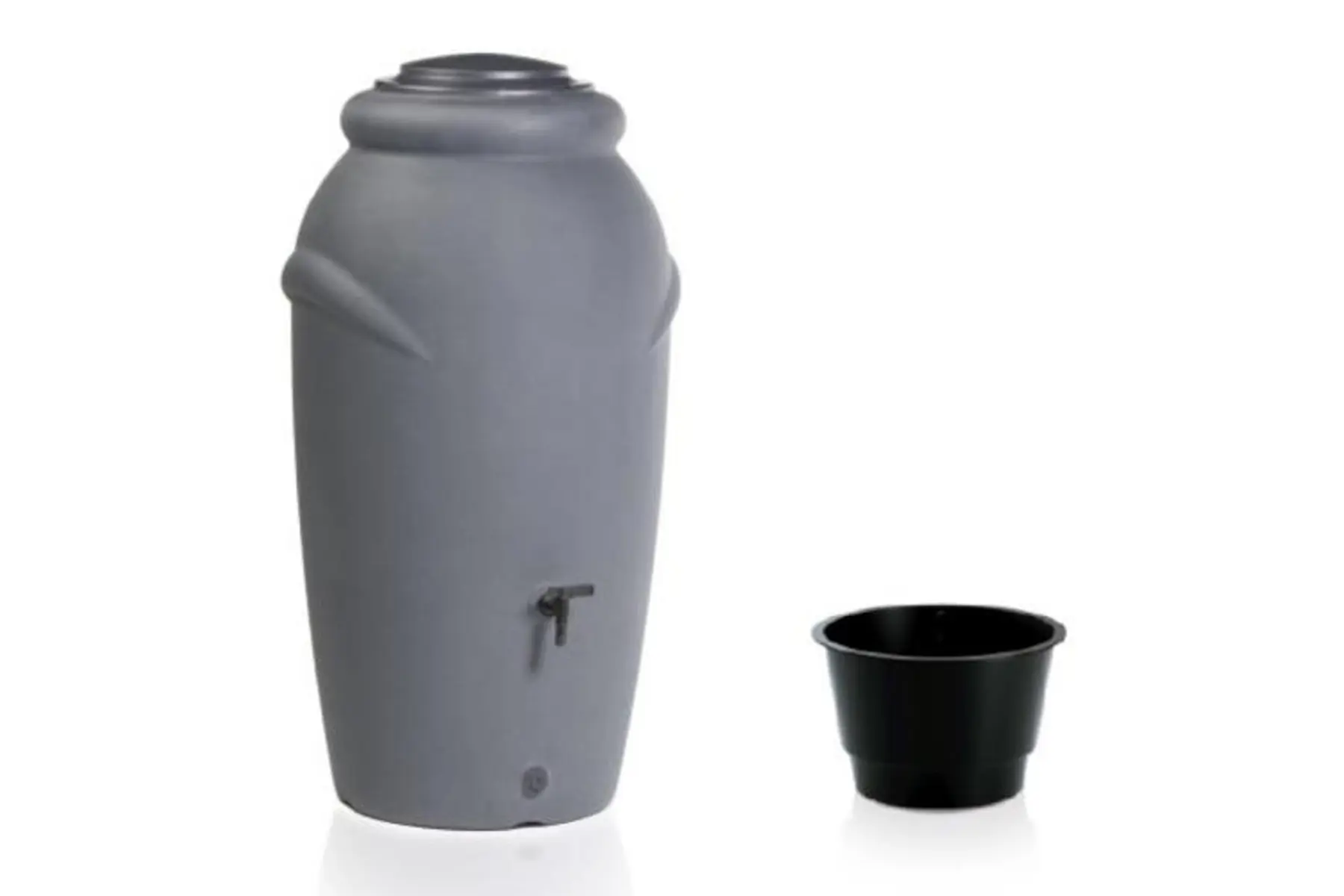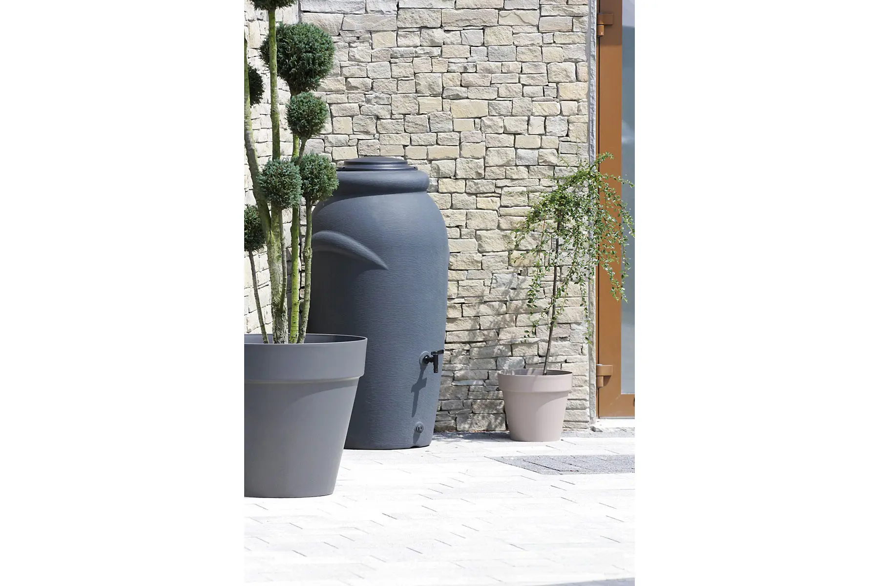Magnifique baril décoratif en plastique pour la collecte des eaux de pluie. Ce canon possède une ouverture en haut avec un couvercle de 26 cm Ø. Elle est faite de plastique durable et ressemble à une grande urne en pierre. Ce modèle plus petit est idéal pour un espace restreint et peut encore collecter de l’eau jusqu’à 210 litres.