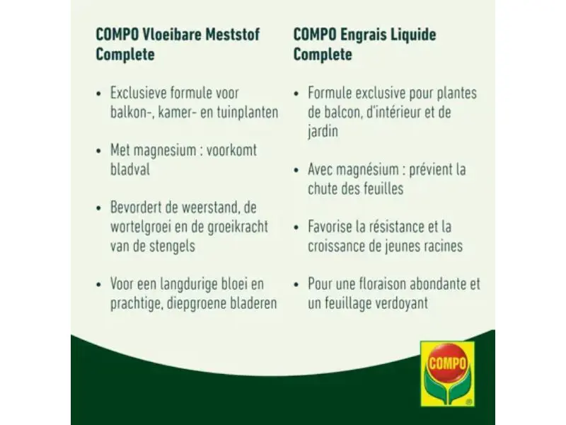 L’engrais liquide Complete de Compo est une formule innovante riche en nutriments pour un meilleur développement de toutes les plantes vertes et à fleurs. La dose supplémentaire de magnésium réduit la chute des feuilles, tandis que le calcium assure des plantes saines et plus solides ainsi qu’une floraison durable. De plus, l’engrais est enrichi en fer pour de magnifiques feuilles vertes.