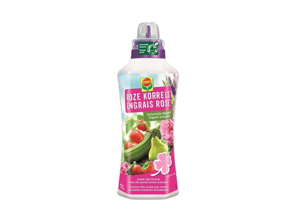 Engrais liquide universel pour plantes d’intérieur, plantes en pot et de balcon, légumes et fruits dans le potager. Les grains roses assurent une bonne croissance, une floraison riche et des fruits fermes.