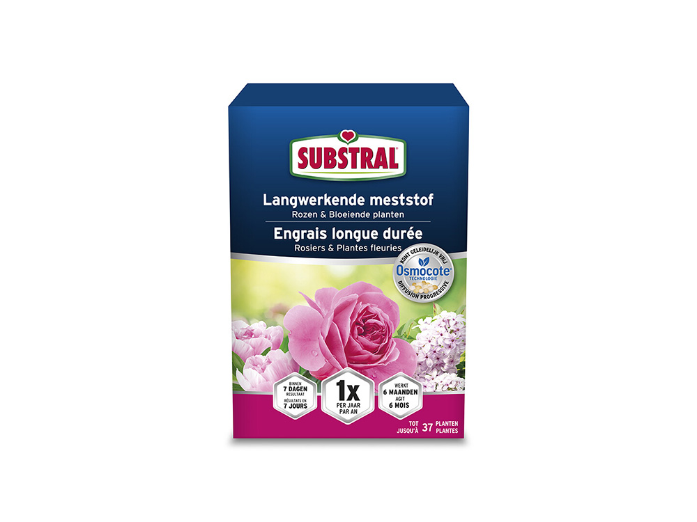 Cet engrais universel de Substral est idéal pour les rosiers et les plantes à fleurs. L’osmocote a été spécialement développée pour tous les types de roses ; arbustes à fleurs comme la rose de Gueldre, la fleur de mariage, l’oléandre,... et des fleurs en terrain ouvert mais aussi dans des contenants et des pots de fleurs.