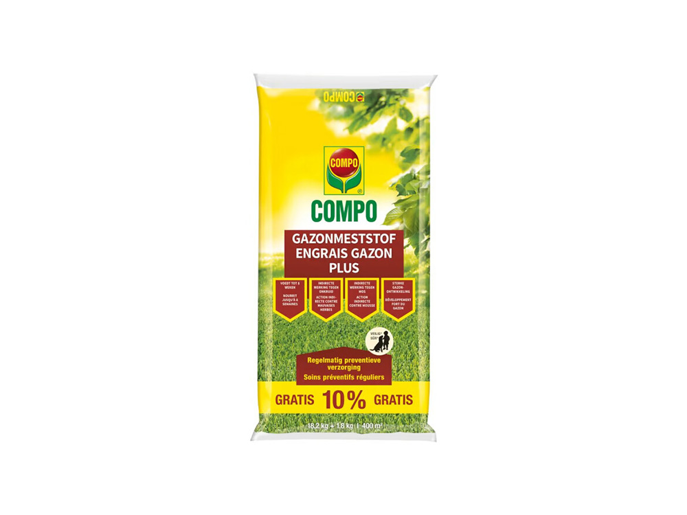Compo Lawn Fertilizer Plus est un engrais organique minéral qui fournit à la pelouse tous les nutriments nécessaires pendant 8 semaines. Cela donne un gazon dense et vert profond. L’engrais a également un effet indirect contre les mauvaises herbes et la mousse. La forte proportion d’éléments végétaux contribue au développement d’une pelouse forte, vitale, dense et d’un vert profond.