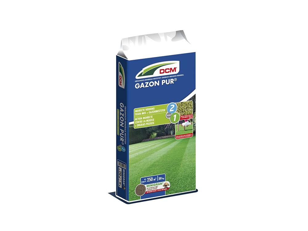 DCM Fertilizer Lawn Pur® en tant que produit 2-en-1 : engrais + contrôle indirect de la mousse. Répandez DCM Lawn Pur et après 2 à 3 semaines, vous verrez la mousse se décolorer et mourir.
