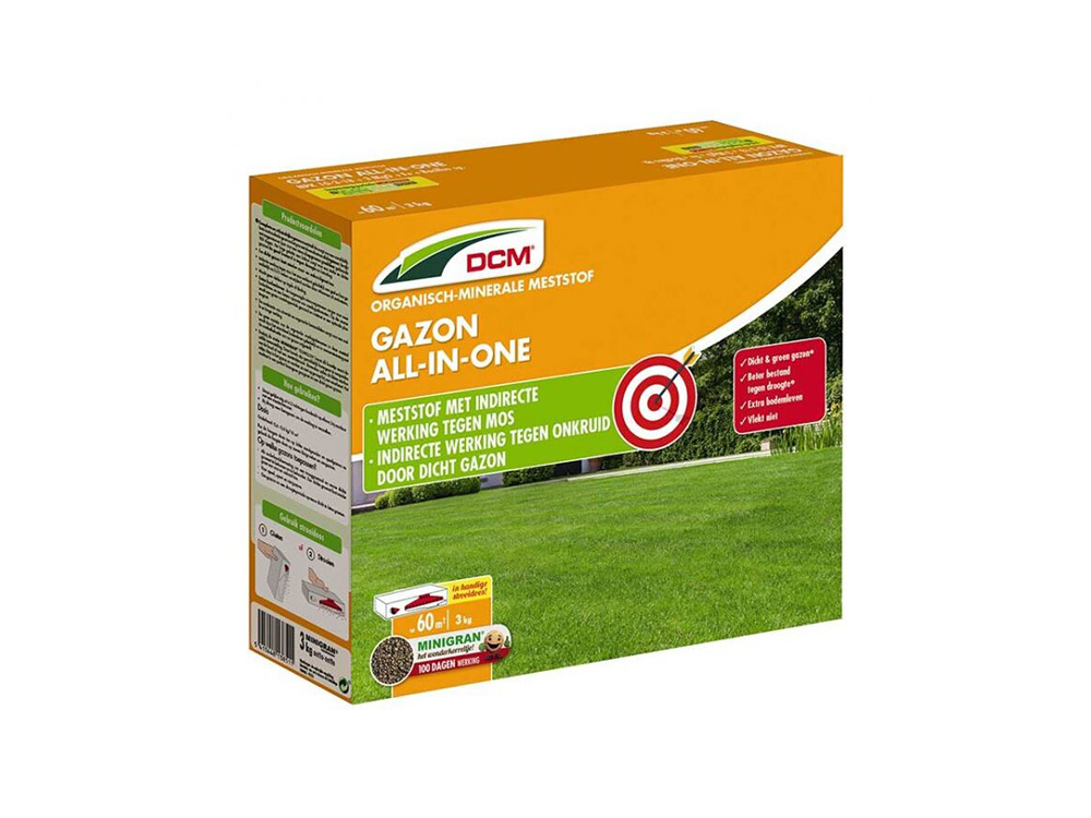 DCM Lawn All-in-One est un engrais complet et riche en azote qui assure une pelouse dense. Une pelouse dense permet moins de mousse et de mauvaises herbes à pousser.