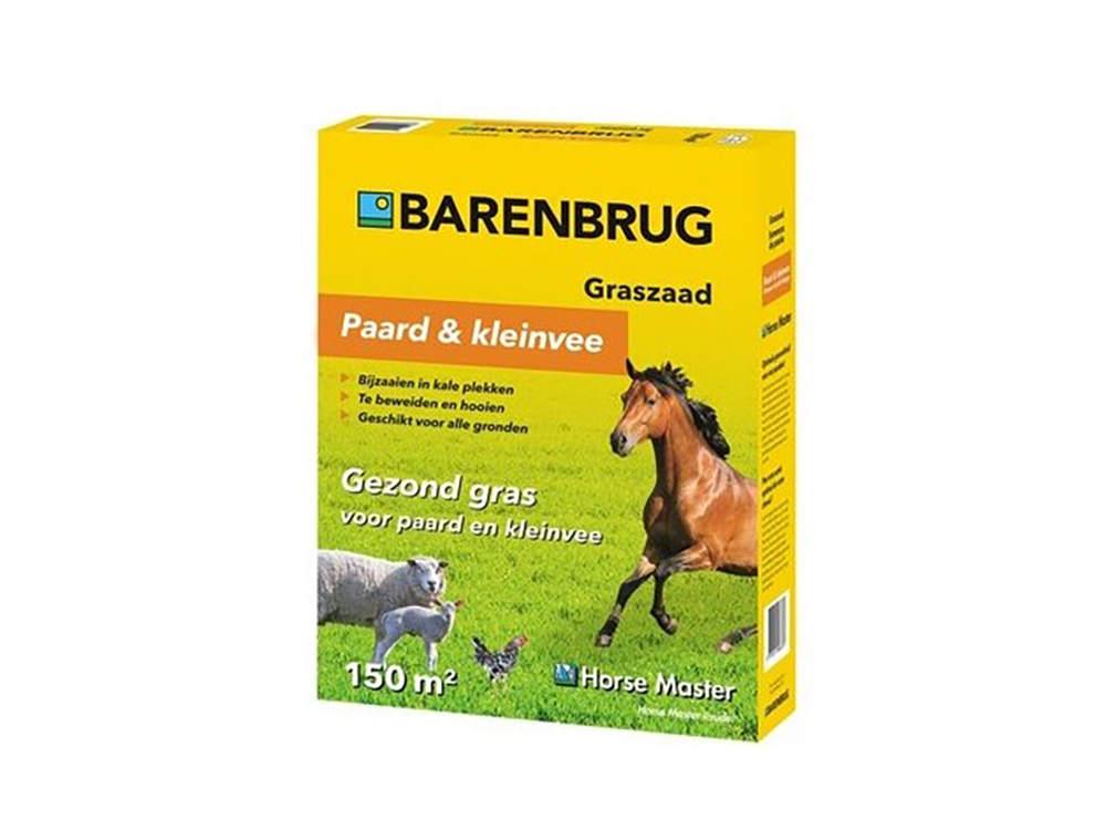 Le mélange d’herbe de prairie Barenbrug Horsemaster pour chevaux et tout petit bétail. Pour le poulailler, une aire de jeux pour les lapins, autour de l’étang pour les oies ou le pâturage pour les chèvres et les moutons.