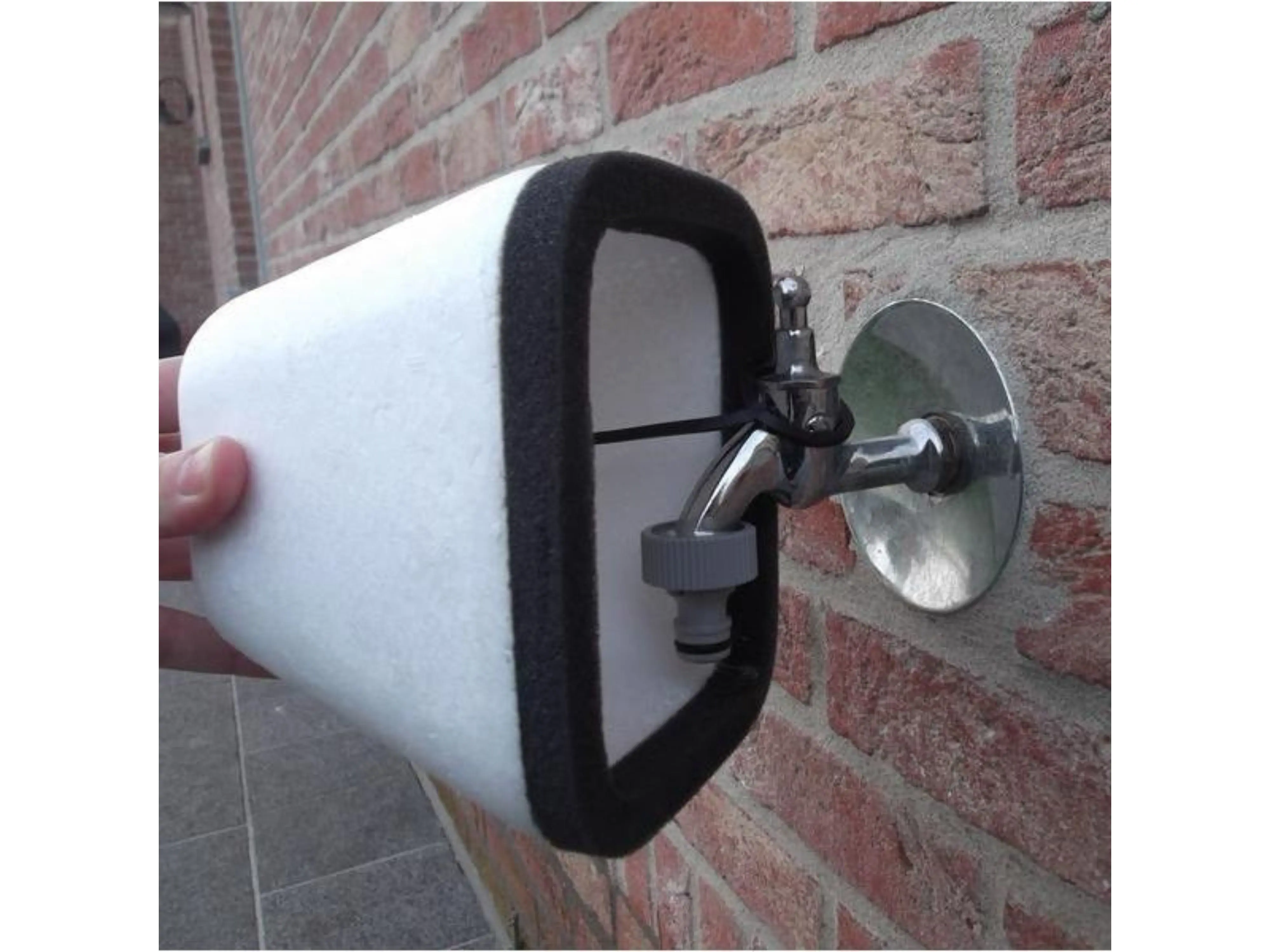 Ce système s’adapte à la plupart des robinets extérieurs. Il est fabriqué en polystyrène avec un bord en matériau souple, flexible et de type mousse, qui s’adapte à la forme du mur et ne laisse aucun interstice. Ainsi, le capuchon s’ajuste parfaitement contre le mur.