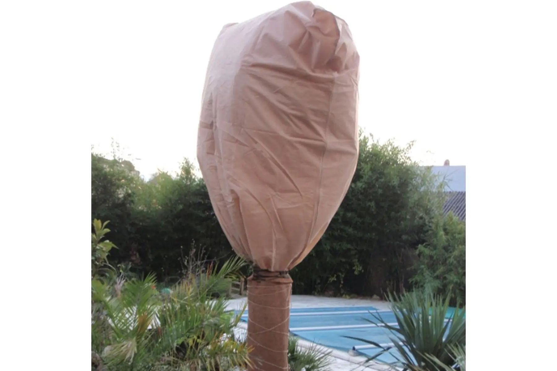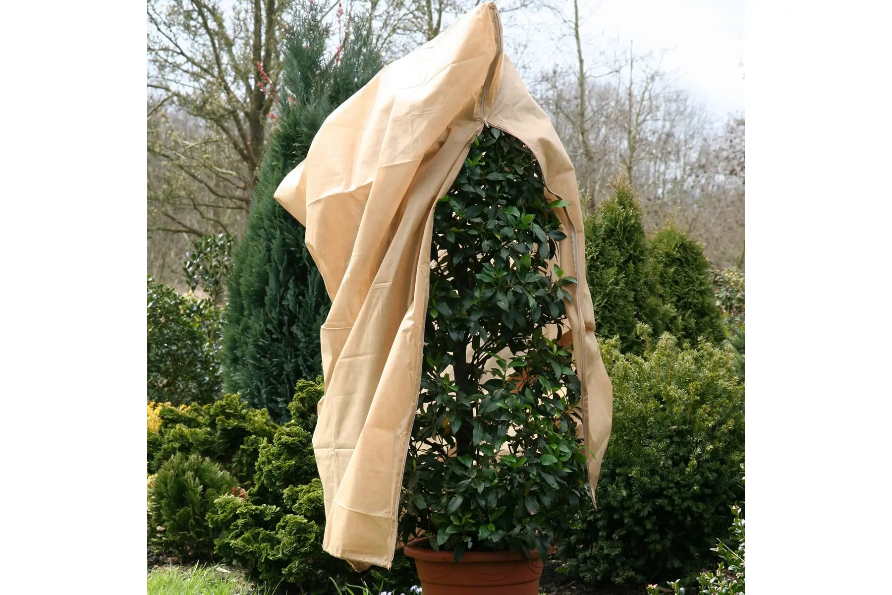 Cette housse anti-gel a une couleur naturelle discrète, une fermeture éclair pratique sur un côté long et un cordon pour serrer la housse en bas autour de la plante ou du pot.