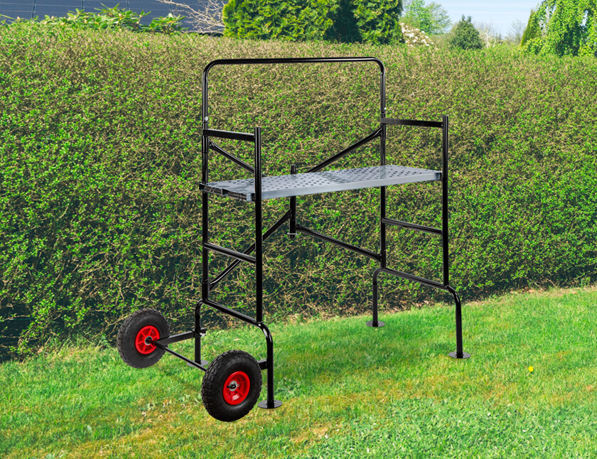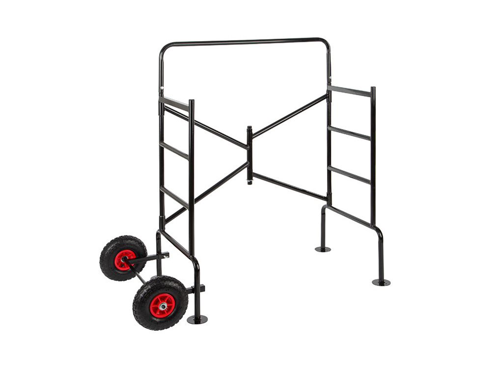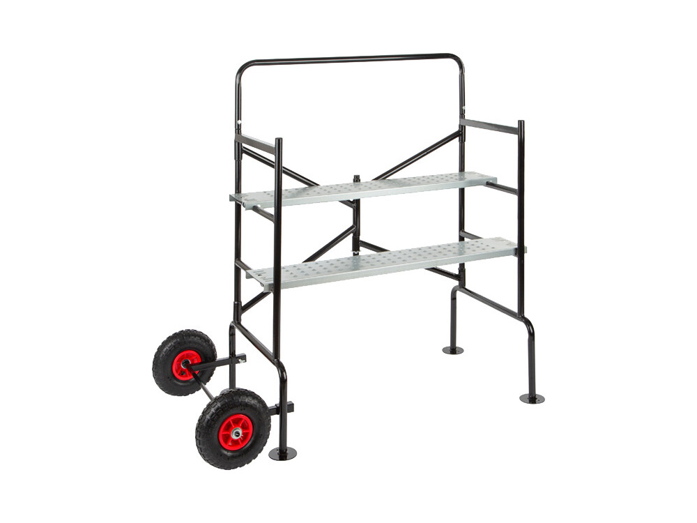 Cet échafaudage pliant pratique est équipé de roues avec freins, il peut être entraîné à travers une porte standard assemblée. Ce rack de loisirs est équipé d’une plateforme antidécollante en deux parties où les pièces peuvent être placées à différentes hauteurs.