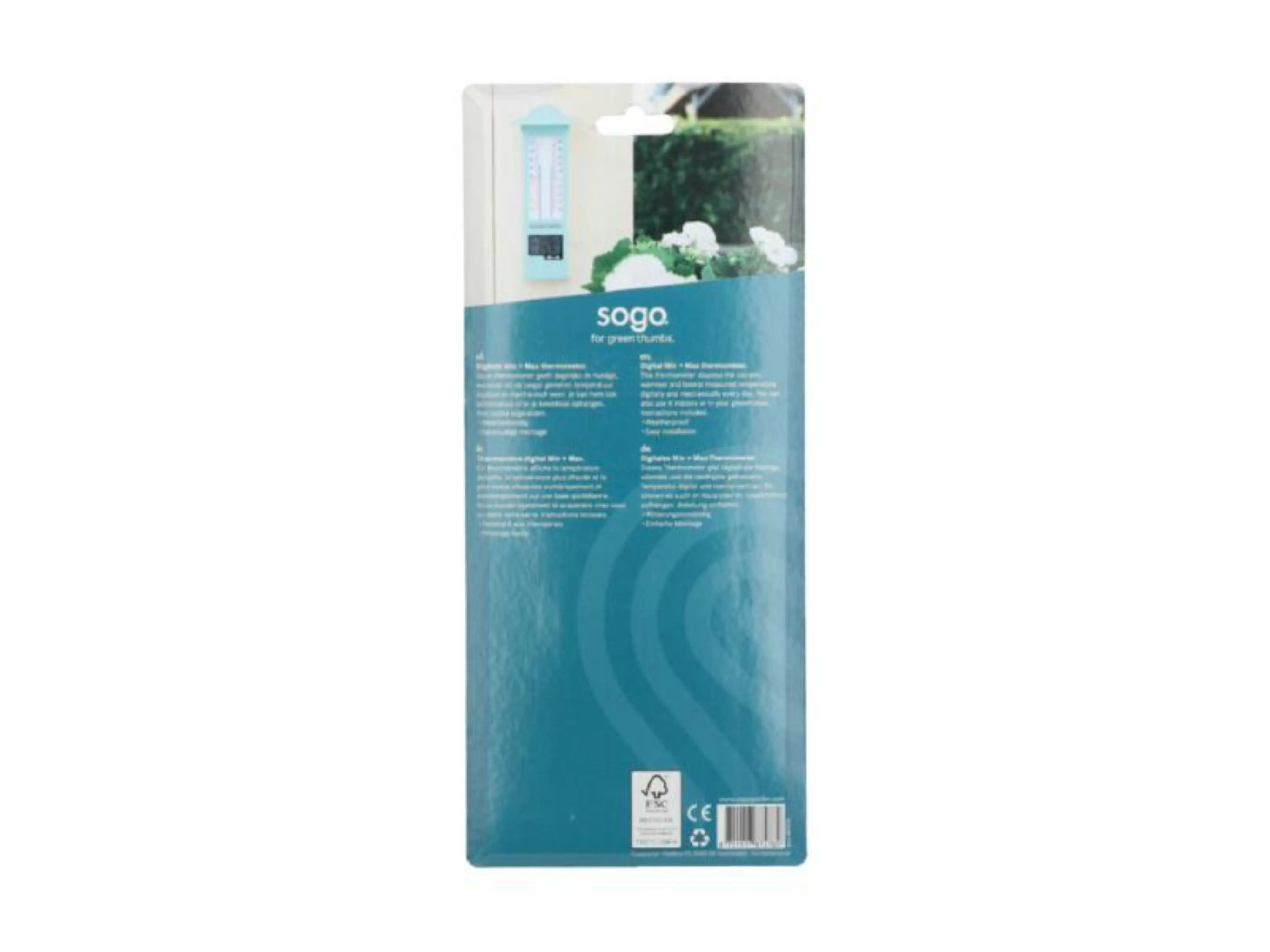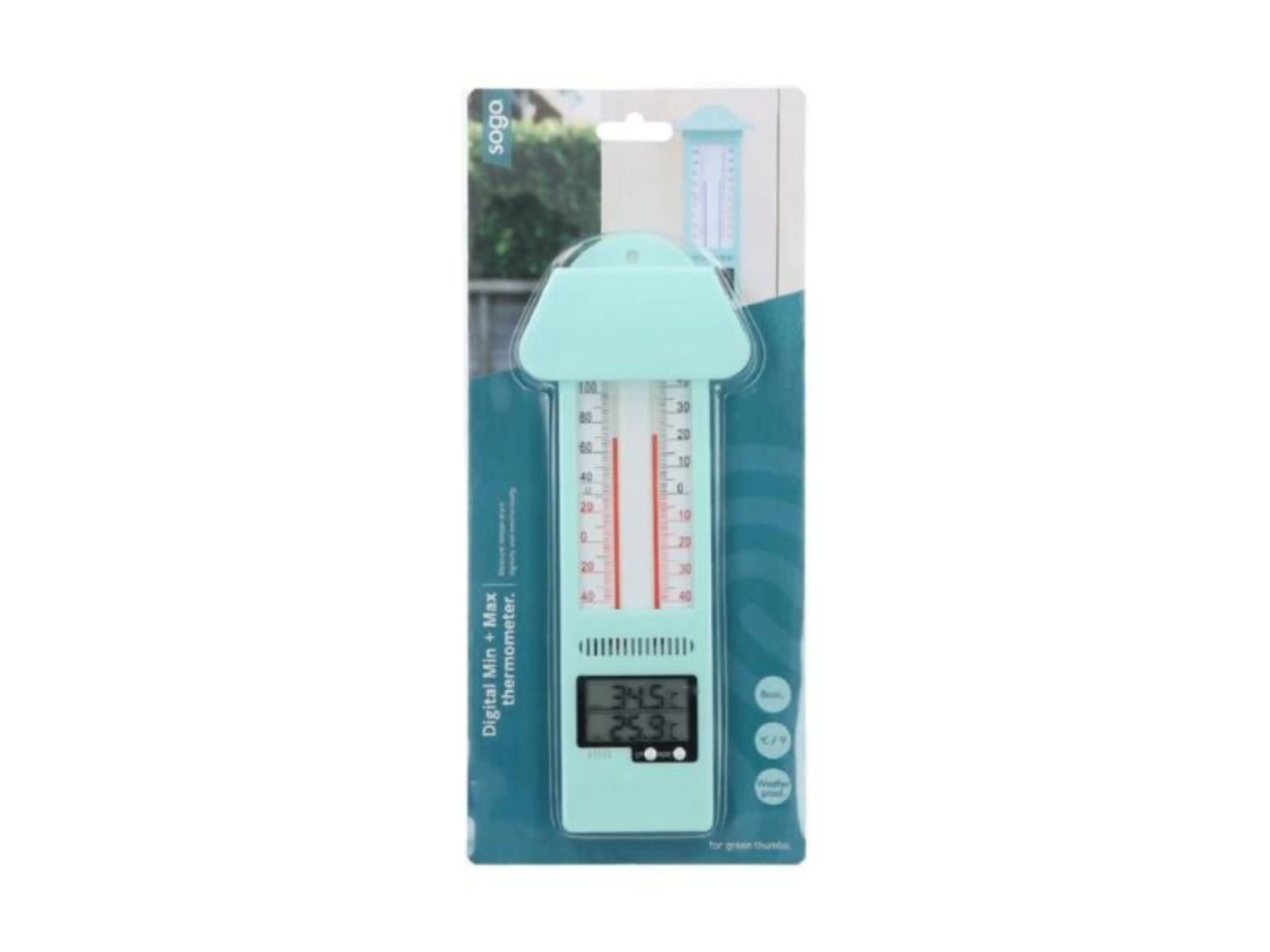 Le thermomètre numérique Sogo affiche la température actuelle quotidiennement, ainsi que les valeurs mesurées les plus élevées et les plus basses – affichées numériquement et mécaniquement . Parfait pour être suspendu à l’intérieur, dans le jardin ou dans votre serre.