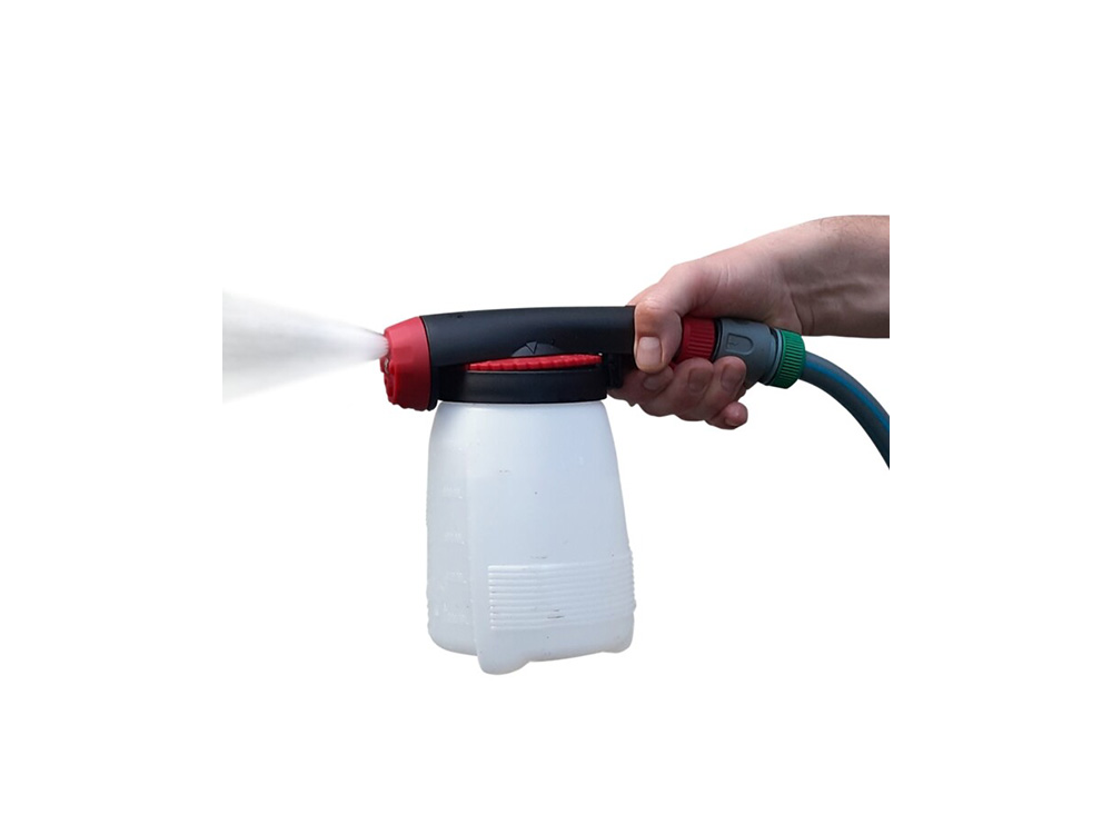 Le Nema-T-Pot est un pulvérisateur manuel multifonctionnel que vous connectez au tuyau d’arrosage et avec lequel vous pouvez facilement diluer et pulvériser des Nema-T-Bags (= nématodes), des engrais ou d’autres liquides sans dosage compliqué et sans vous salir les mains. Vous pouvez aussi l’utiliser pour nettoyer avec du savon ou d’autres produits de nettoyage en combinaison avec le tuyau d’eau.