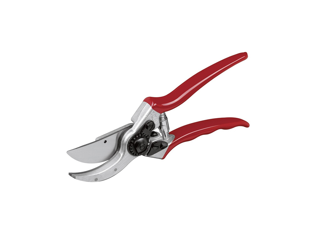 Couteau avec coupe-fil, enclume avec rainure de sève, lame inférieure rivetée et poignées en alliage d’aluminium forgé. Les poignées robustes sont équipées d’amortisseurs en caoutchouc pour protéger les poignets. Un écrou denté assure un réglage simple et précis de la lame supérieure et inférieure, ce qui assure une plaie de taille lisse. Les lames sont faciles à remplacer en cas d’usure ou de dommage.