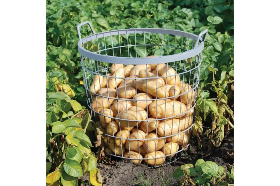 Un véritable panier en métal, traditionnellement utilisé pour récolter des pommes de terre, des poires, des pommes,... La conception du panier permet à l’excès de terre de tomber, réduisant ainsi le poids lors de la récolte. De plus, la structure ouverte facilite le rinçage de la récolte, car l’eau et la terre peuvent s’écouler facilement.