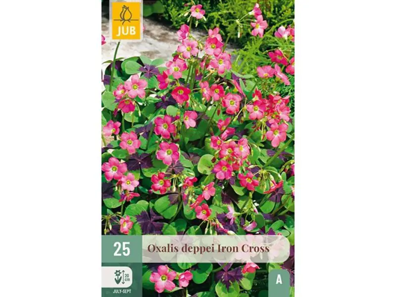 Plantez cet oxalis au printemps à une profondeur d’environ 5 cm. La période de floraison s’étend de mai à octobre et la plante atteint une hauteur d’environ 20 cm. Oxalis deppei 'Iron Cross' est idéal comme couverture végétale dans la bordure, mais se porte aussi très bien en pots.
