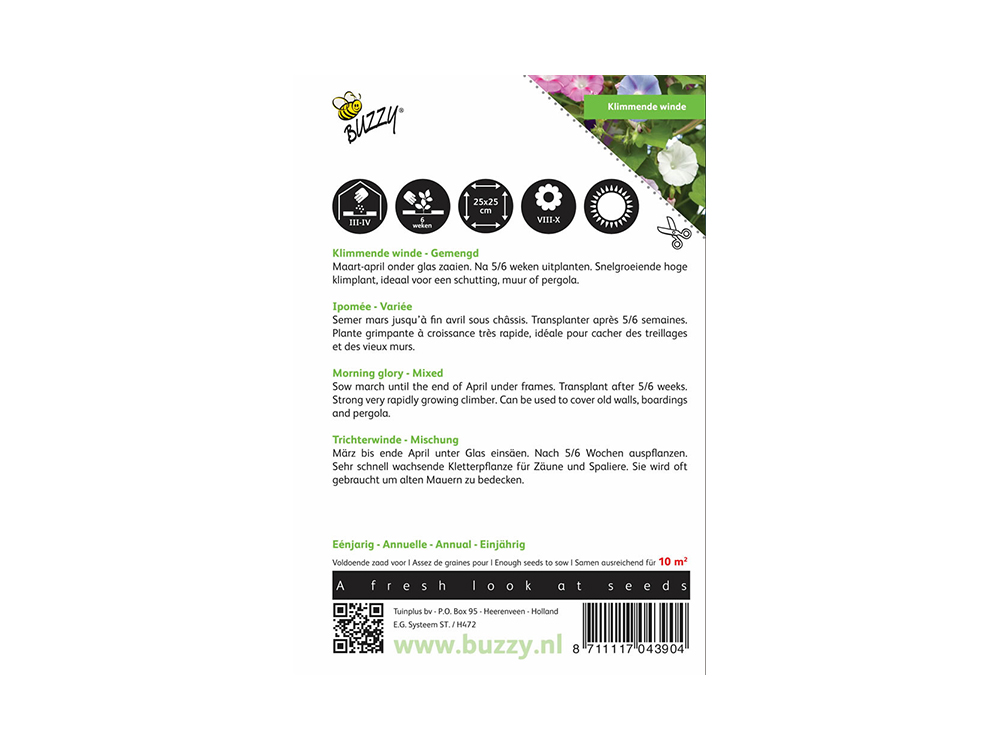 Dans le jardin, vous pouvez les planter en terrain découvert, appuyés contre un support grimpant ainsi que dans des bacs de fleurs. Idéal pour la végétation annuelle de murs et de clôtures. Semez sous verre de la mi-mars à la mi-avril ou à l’extérieur dans un lit de semis de la mi-avril à la mi-mai. Plantez 5 à 6 semaines après le semis.