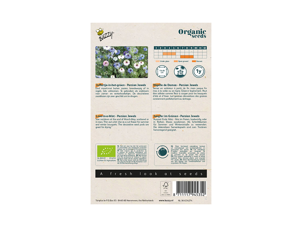 Nigella damascena fleurit avec des fleurs dans différentes nuances, allant du bleu clair au lilas, blanc et rose. Les fleurs sont spéciales et entourées de fines feuilles plumeuses. Après la floraison, des gousses spéciales apparaissent et sont agréables à utiliser dans un arrangement floral. Les gousses décoratives sont aussi parfaites pour sécher.