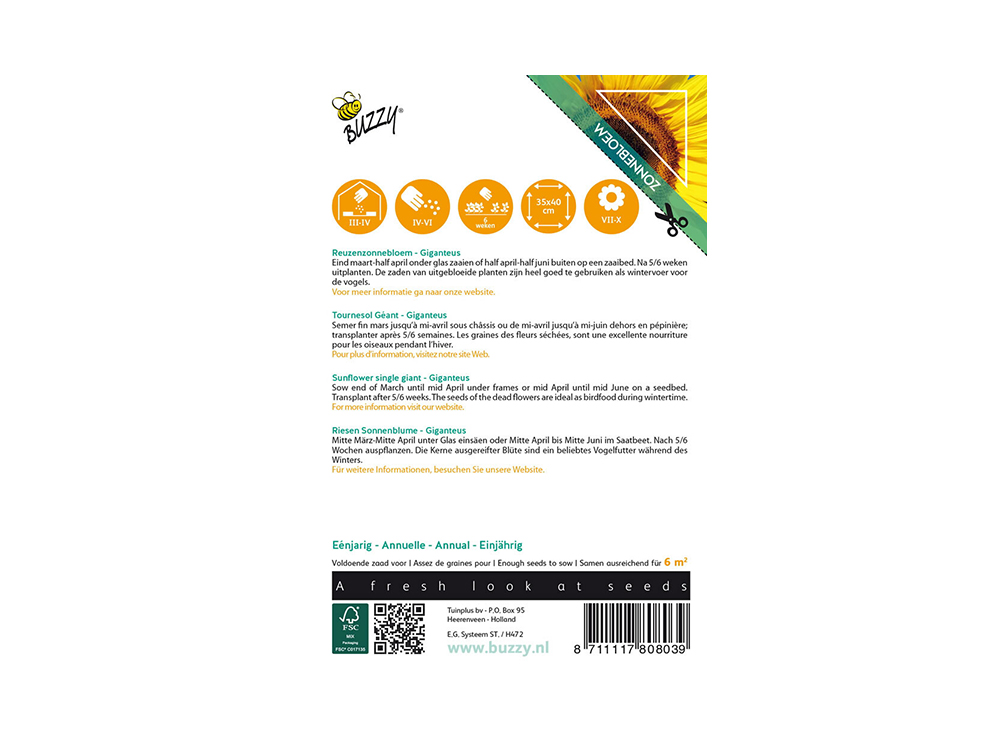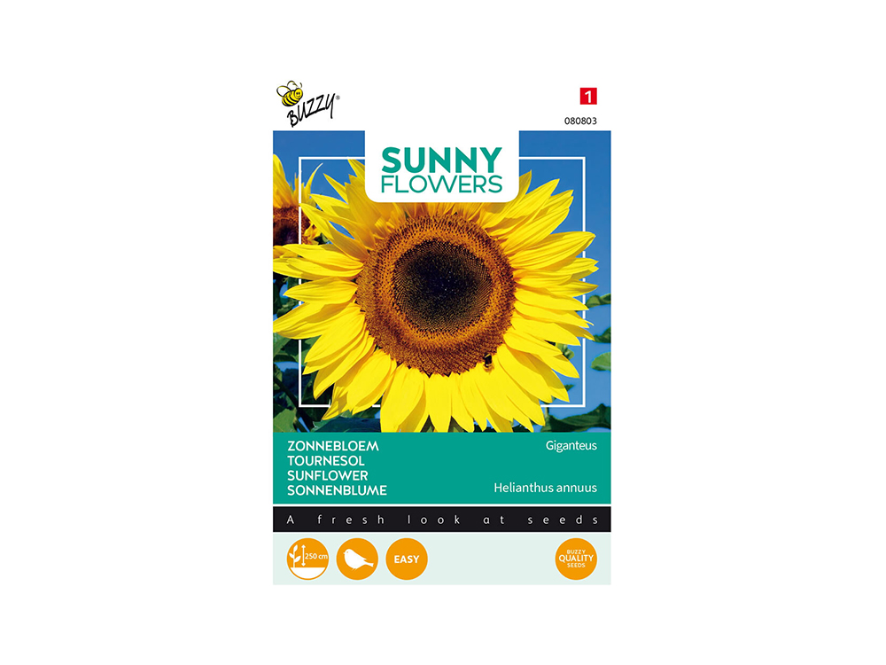 Le tournesol géant Giganteus fleurit avec une énorme fleur par tige d’une hauteur pouvant atteindre 250 cm ! Les graines des plantes fanées sont une excellente nourriture hivernale pour de nombreux oiseaux.
