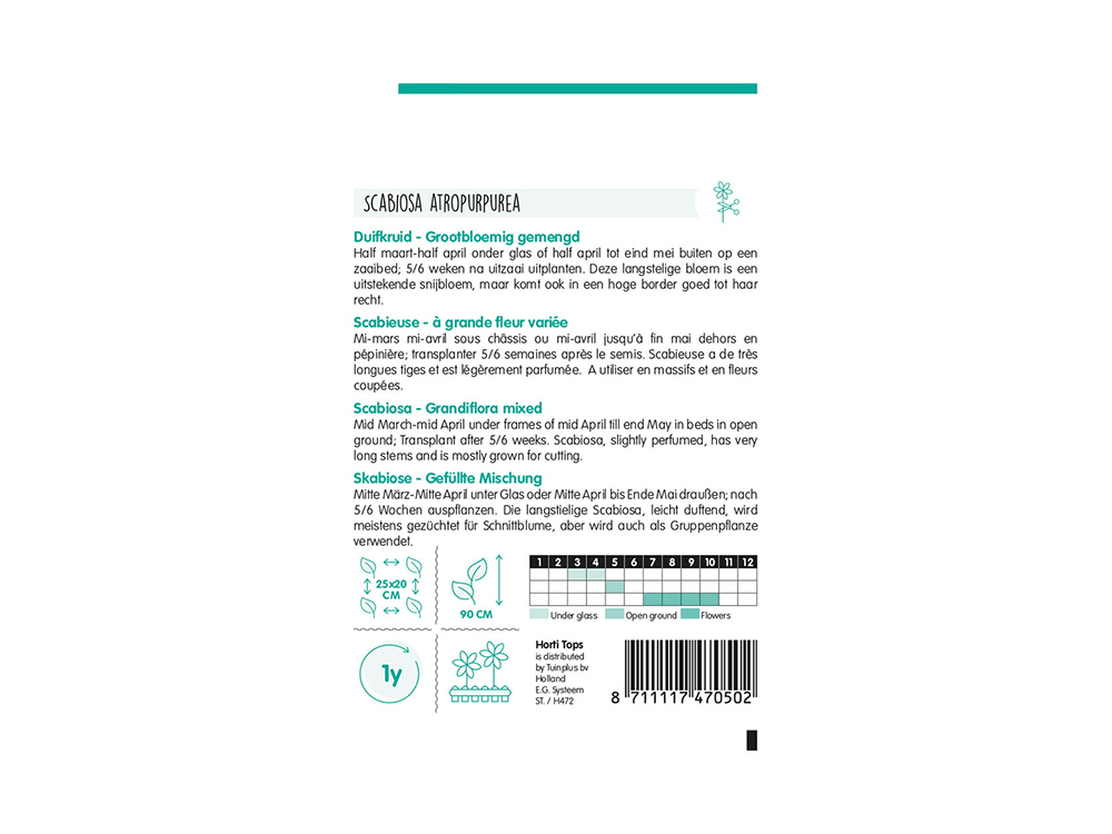 Semez la scabiose de la mi-mars/avril sous verre ou de la mi-avril jusqu’à la fin mai à l’extérieur, dans un lit de semences. Plantez 5 à 6 semaines après le semis.