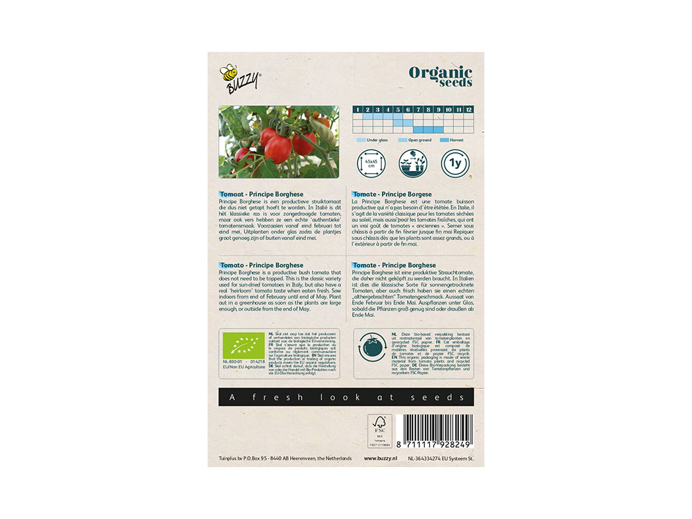 La tomate Principe Borghese est une variété italienne populaire avec un grand rendement de tomates rouge foncé en forme d'œuf. C'est une tomate de brousse productive qui n'a pas besoin d'être étêtée. Elles sont souvent utilisées pour les tomates séchées au soleil, mais sont également délicieuses fraîches ! Semer de fin février à fin mai à une température d'environ 20°C. Dès que les plants sont suffisamment grands, plantez-les sous serre ou à l'extérieur dès la fin mai.